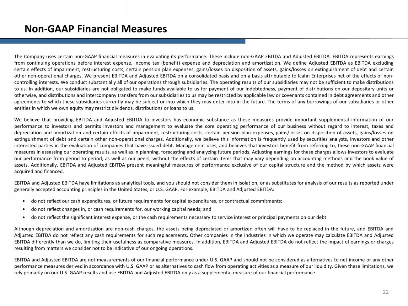 22 Non - GAAP Financial Measures The Company uses certain non - GAAP financial measures in evaluating its performance . These include non - GAAP EBITDA and Adjusted EBITDA . EBITDA represents earnings from continuing operations before interest expense, income tax (benefit) expense and depreciation and amortization . We define Adjusted EBITDA as EBITDA excluding certain effects of impairment, restructuring costs, certain pension plan expenses, gains/losses on disposition of assets, gains/losses on extinguishment of debt and certain other non - operational charges . We present EBITDA and Adjusted EBITDA on a consolidated basis and on a basis attributable to Icahn Enterprises net of the effects of non - controlling interests . We conduct substantially all of our operations through subsidiaries . The operating results of our subsidiaries may not be sufficient to make distributions to us . In addition, our subsidiaries are not obligated to make funds available to us for payment of our indebtedness, payment of distributions on our depositary units or otherwise, and distributions and intercompany transfers from our subsidiaries to us may be restricted by applicable law or covenants contained in debt agreements and other agreements to which these subsidiaries currently may be subject or into which they may enter into in the future . The terms of any borrowings of our subsidiaries or other entities in which we own equity may restrict dividends, distributions or loans to us . We believe that providing EBITDA and Adjusted EBITDA to investors has economic substance as these measures provide important supplemental information of our performance to investors and permits investors and management to evaluate the core operating performance of our business without regard to interest, taxes and depreciation and amortization and certain effects of impairment, restructuring costs, certain pension plan expenses, gains/losses on disposition of assets, gains/losses on extinguishment of debt and certain other non - operational charges . Additionally, we believe this information is frequently used by securities analysts, investors and other interested parties in the evaluation of companies that have issued debt . Management uses, and believes that investors benefit from referring to, these non - GAAP financial measures in assessing our operating results, as well as in planning, forecasting and analyzing future periods . Adjusting earnings for these charges allows investors to evaluate our performance from period to period, as well as our peers, without the effects of certain items that may vary depending on accounting methods and the book value of assets . Additionally, EBITDA and Adjusted EBITDA present meaningful measures of performance exclusive of our capital structure and the method by which assets were acquired and financed . EBITDA and Adjusted EBITDA have limitations as analytical tools, and you should not consider them in isolation, or as substitutes for analysis of our results as reported under generally accepted accounting principles in the United States, or U . S . GAAP . For example, EBITDA and Adjusted EBITDA : • do not reflect our cash expenditures, or future requirements for capital expenditures, or contractual commitments ; • do not reflect changes in, or cash requirements for, our working capital needs ; and • do not reflect the significant interest expense, or the cash requirements necessary to service interest or principal payments on our debt . Although depreciation and amortization are non - cash charges, the assets being depreciated or amortized often will have to be replaced in the future, and EBITDA and Adjusted EBITDA do not reflect any cash requirements for such replacements . Other companies in the industries in which we operate may calculate EBITDA and Adjusted EBITDA differently than we do, limiting their usefulness as comparative measures . In addition, EBITDA and Adjusted EBITDA do not reflect the impact of earnings or charges resulting from matters we consider not to be indicative of our ongoing operations . EBITDA and Adjusted EBITDA are not measurements of our financial performance under U . S . GAAP and should not be considered as alternatives to net income or any other performance measures derived in accordance with U . S . GAAP or as alternatives to cash flow from operating activities as a measure of our liquidity . Given these limitations, we rely primarily on our U . S . GAAP results and use EBITDA and Adjusted EBITDA only as a supplemental measure of our financial performance .
