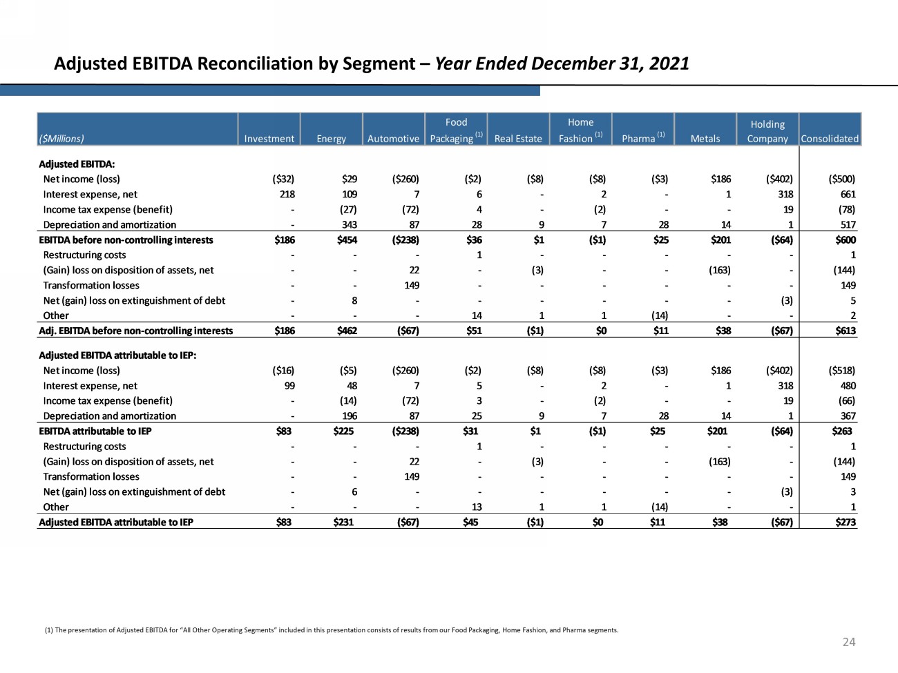 23 Adjusted EBITDA Reconciliation by Segment – Year Ended December 31, 2022 (1) The presentation of Adjusted EBITDA for “All Other Operating Segments” included in this presentation consists of results fro m our Food Packaging, Home Fashion, and Pharma segments. Net income (loss) ($223) $596 ($192) $2 $7 ($22) ($18) ($175) ($25) Interest expense, net 173 84 2 8 - 3 (1) 259 528 Income tax expense (benefit) - 140 (54) 7 - - - (59) 34 Depreciation and amortization - 353 80 27 13 7 28 1 509 ($50) $1,173 ($164) $44 $20 ($12) $9 $26 $1,046 Restructuring costs - - - - - 2 - - 2 (Gain) loss on disposition of assets, net - - (3) - - - - - (3) Transformation losses - - 53 - - - - - 53 Net (gain) loss on extinguishment of debt - - - - - - - 1 1 Out of period adjustments - - 51 1 - - - - 52 Call option lawsuits settlement - 79 - - - - - - 79 Other - 1 32 6 - - 1 - 40 ($50) $1,253 ($31) $51 $20 ($10) $10 $27 $1,270 Net income (loss) ($89) $304 ($192) $2 $7 ($22) ($18) ($175) ($183) Interest expense, net 79 44 2 7 - 3 (1) 259 393 Income tax expense (benefit) - 103 (54) 6 - - - (59) (4) Depreciation and amortization - 199 80 24 13 7 28 1 352 ($10) $650 ($164) $39 $20 ($12) $9 $26 $558 Restructuring costs - - - - - 2 - - 2 (Gain) loss on disposition of assets, net - - (3) - - - - - (3) Transformation losses - - 53 - - - - - 53 Net (gain) loss on extinguishment of debt - - - - - - - 1 1 Out of period adjustments - - 51 1 - - - - 52 Call option lawsuits settlement - 56 - - - - - - 56 Other - 1 32 5 - - 1 - 39 ($10) $707 ($31) $45 $20 ($10) $10 $27 $758 Home Fashion (1) Pharma (1) ($Millions) Investment Energy Automotive Food Packaging (1) Real Estate Holding Company Consolidated Adj. EBITDA before non-controlling interests Adjusted EBITDA: EBITDA before non-controlling interests Adjusted EBITDA attributable to IEP: EBITDA attributable to IEP Adjusted EBITDA attributable to IEP