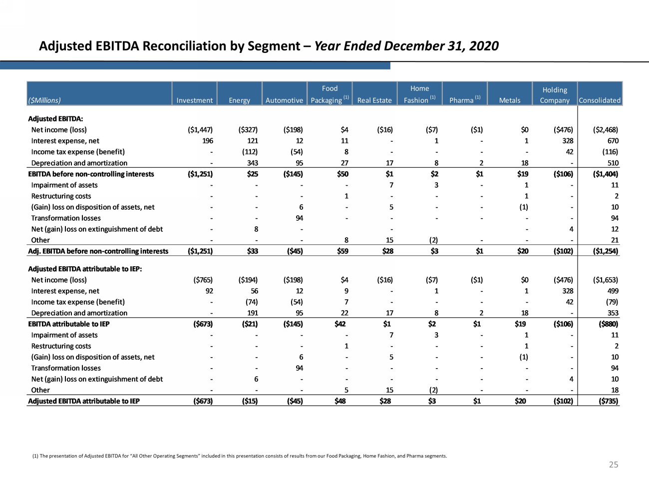 24 Adjusted EBITDA Reconciliation by Segment – Year Ended December 31, 2021 (1) The presentation of Adjusted EBITDA for “All Other Operating Segments” included in this presentation consists of results fro m our Food Packaging, Home Fashion, and Pharma segments. Net income (loss) ($32) $29 ($260) ($2) ($8) ($8) ($3) $186 ($402) ($500) Interest expense, net 218 109 7 6 - 2 - 1 318 661 Income tax expense (benefit) - (27) (72) 4 - (2) - - 19 (78) Depreciation and amortization - 343 87 28 9 7 28 14 1 517 $186 $454 ($238) $36 $1 ($1) $25 $201 ($64) $600 Restructuring costs - - - 1 - - - - - 1 (Gain) loss on disposition of assets, net - - 22 - (3) - - (163) - (144) Transformation losses - - 149 - - - - - - 149 Net (gain) loss on extinguishment of debt - 8 - - - - - - (3) 5 Other - - - 14 1 1 (14) - - 2 $186 $462 ($67) $51 ($1) $0 $11 $38 ($67) $613 Net income (loss) ($16) ($5) ($260) ($2) ($8) ($8) ($3) $186 ($402) ($518) Interest expense, net 99 48 7 5 - 2 - 1 318 480 Income tax expense (benefit) - (14) (72) 3 - (2) - - 19 (66) Depreciation and amortization - 196 87 25 9 7 28 14 1 367 $83 $225 ($238) $31 $1 ($1) $25 $201 ($64) $263 Restructuring costs - - - 1 - - - - - 1 (Gain) loss on disposition of assets, net - - 22 - (3) - - (163) - (144) Transformation losses - - 149 - - - - - - 149 Net (gain) loss on extinguishment of debt - 6 - - - - - - (3) 3 Other - - - 13 1 1 (14) - - 1 $83 $231 ($67) $45 ($1) $0 $11 $38 ($67) $273 Adjusted EBITDA attributable to IEP: EBITDA attributable to IEP Adjusted EBITDA attributable to IEP EBITDA before non-controlling interests Adj. EBITDA before non-controlling interests Adjusted EBITDA: ($Millions) Investment Energy Automotive Food Packaging (1) Real Estate Home Fashion (1) Pharma (1) Metals Consolidated Holding Company