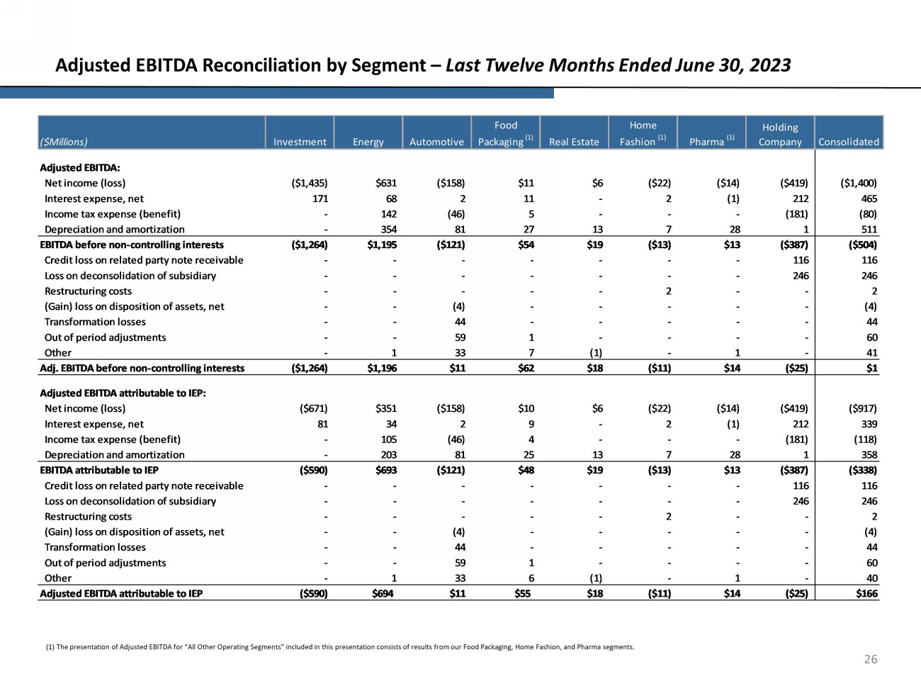 25 Adjusted EBITDA Reconciliation by Segment – Year Ended December 31, 2020 (1) The presentation of Adjusted EBITDA for “All Other Operating Segments” included in this presentation consists of results fro m our Food Packaging, Home Fashion, and Pharma segments. Net income (loss) ($1,447) ($327) ($198) $4 ($16) ($7) ($1) $0 ($476) ($2,468) Interest expense, net 196 121 12 11 - 1 - 1 328 670 Income tax expense (benefit) - (112) (54) 8 - - - - 42 (116) Depreciation and amortization - 343 95 27 17 8 2 18 - 510 ($1,251) $25 ($145) $50 $1 $2 $1 $19 ($106) ($1,404) Impairment of assets - - - - 7 3 - 1 - 11 Restructuring costs - - - 1 - - - 1 - 2 (Gain) loss on disposition of assets, net - - 6 - 5 - - (1) - 10 Transformation losses - - 94 - - - - - - 94 Net (gain) loss on extinguishment of debt - 8 - - - 4 12 Other - - - 8 15 (2) - - - 21 ($1,251) $33 ($45) $59 $28 $3 $1 $20 ($102) ($1,254) Net income (loss) ($765) ($194) ($198) $4 ($16) ($7) ($1) $0 ($476) ($1,653) Interest expense, net 92 56 12 9 - 1 - 1 328 499 Income tax expense (benefit) - (74) (54) 7 - - - - 42 (79) Depreciation and amortization - 191 95 22 17 8 2 18 - 353 ($673) ($21) ($145) $42 $1 $2 $1 $19 ($106) ($880) Impairment of assets - - - - 7 3 - 1 - 11 Restructuring costs - - - 1 - - - 1 - 2 (Gain) loss on disposition of assets, net - - 6 - 5 - - (1) - 10 Transformation losses - - 94 - - - - - - 94 Net (gain) loss on extinguishment of debt - 6 - - - - - - 4 10 Other - - - 5 15 (2) - - - 18 ($673) ($15) ($45) $48 $28 $3 $1 $20 ($102) ($735) ($Millions) Investment Energy Automotive Food Packaging (1) Real Estate Home Fashion (1) Pharma (1) Holding Company ConsolidatedMetals Adjusted EBITDA attributable to IEP Adjusted EBITDA: EBITDA before non-controlling interests Adj. EBITDA before non-controlling interests Adjusted EBITDA attributable to IEP: EBITDA attributable to IEP
