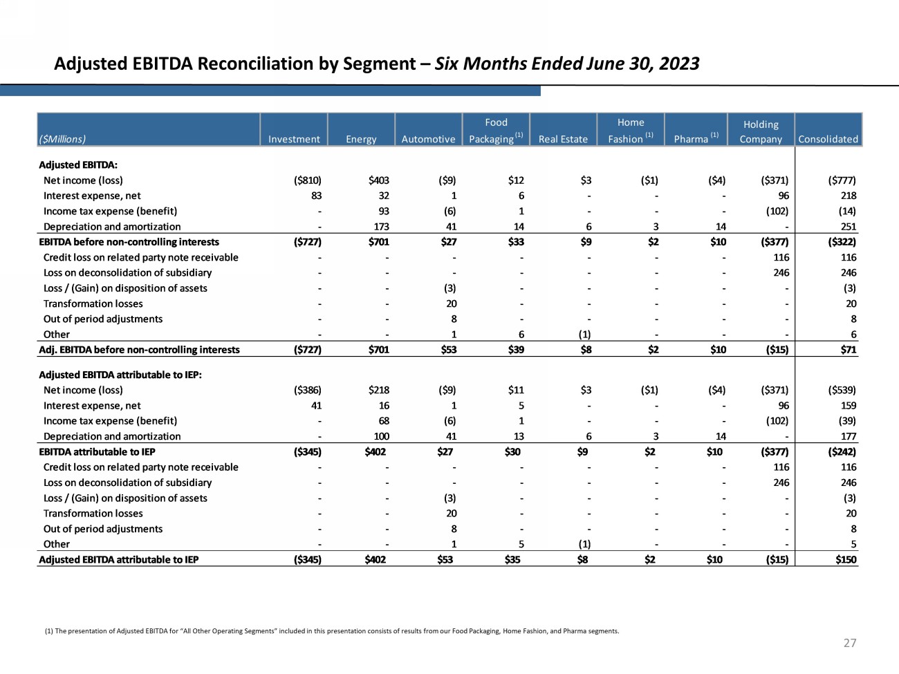 26 Adjusted EBITDA Reconciliation by Segment – Last Twelve Months Ended June 30, 2023 (1) The presentation of Adjusted EBITDA for “All Other Operating Segments” included in this presentation consists of results fro m our Food Packaging, Home Fashion, and Pharma segments. Net income (loss) ($1,435) $631 ($158) $11 $6 ($22) ($14) ($419) ($1,400) Interest expense, net 171 68 2 11 - 2 (1) 212 465 Income tax expense (benefit) - 142 (46) 5 - - - (181) (80) Depreciation and amortization - 354 81 27 13 7 28 1 511 ($1,264) $1,195 ($121) $54 $19 ($13) $13 ($387) ($504) Credit loss on related party note receivable - - - - - - - 116 116 Loss on deconsolidation of subsidiary - - - - - - - 246 246 Restructuring costs - - - - - 2 - - 2 (Gain) loss on disposition of assets, net - - (4) - - - - - (4) Transformation losses - - 44 - - - - - 44 Out of period adjustments - - 59 1 - - - - 60 Other - 1 33 7 (1) - 1 - 41 ($1,264) $1,196 $11 $62 $18 ($11) $14 ($25) $1 Net income (loss) ($671) $351 ($158) $10 $6 ($22) ($14) ($419) ($917) Interest expense, net 81 34 2 9 - 2 (1) 212 339 Income tax expense (benefit) - 105 (46) 4 - - - (181) (118) Depreciation and amortization - 203 81 25 13 7 28 1 358 ($590) $693 ($121) $48 $19 ($13) $13 ($387) ($338) Credit loss on related party note receivable - - - - - - - 116 116 Loss on deconsolidation of subsidiary - - - - - - - 246 246 Restructuring costs - - - - - 2 - - 2 (Gain) loss on disposition of assets, net - - (4) - - - - - (4) Transformation losses - - 44 - - - - - 44 Out of period adjustments - - 59 1 - - - - 60 Other - 1 33 6 (1) - 1 - 40 ($590) $694 $11 $55 $18 ($11) $14 ($25) $166 ($Millions) Investment Energy Automotive Food Packaging (1) Real Estate Home Fashion (1) Pharma (1) Holding Company Consolidated Adjusted EBITDA attributable to IEP Adjusted EBITDA: EBITDA before non-controlling interests Adj. EBITDA before non-controlling interests Adjusted EBITDA attributable to IEP: EBITDA attributable to IEP