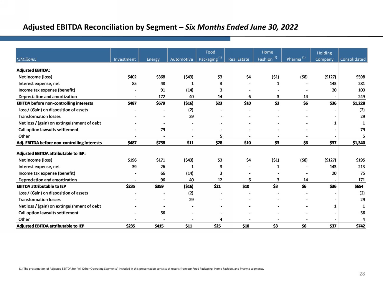 27 Adjusted EBITDA Reconciliation by Segment – Six Months Ended June 30, 2023 (1) The presentation of Adjusted EBITDA for “All Other Operating Segments” included in this presentation consists of results fro m our Food Packaging, Home Fashion, and Pharma segments. Net income (loss) ($810) $403 ($9) $12 $3 ($1) ($4) ($371) ($777) Interest expense, net 83 32 1 6 - - - 96 218 Income tax expense (benefit) - 93 (6) 1 - - - (102) (14) Depreciation and amortization - 173 41 14 6 3 14 - 251 ($727) $701 $27 $33 $9 $2 $10 ($377) ($322) Credit loss on related party note receivable - - - - - - - 116 116 Loss on deconsolidation of subsidiary - - - - - - - 246 246 Loss / (Gain) on disposition of assets - - (3) - - - - - (3) Transformation losses - - 20 - - - - - 20 Out of period adjustments - - 8 - - - - - 8 Other - - 1 6 (1) - - - 6 ($727) $701 $53 $39 $8 $2 $10 ($15) $71 Net income (loss) ($386) $218 ($9) $11 $3 ($1) ($4) ($371) ($539) Interest expense, net 41 16 1 5 - - - 96 159 Income tax expense (benefit) - 68 (6) 1 - - - (102) (39) Depreciation and amortization - 100 41 13 6 3 14 - 177 ($345) $402 $27 $30 $9 $2 $10 ($377) ($242) Credit loss on related party note receivable - - - - - - - 116 116 Loss on deconsolidation of subsidiary - - - - - - - 246 246 Loss / (Gain) on disposition of assets - - (3) - - - - - (3) Transformation losses - - 20 - - - - - 20 Out of period adjustments - - 8 - - - - - 8 Other - - 1 5 (1) - - - 5 ($345) $402 $53 $35 $8 $2 $10 ($15) $150 ($Millions) Investment Energy Automotive Food Packaging (1) Real Estate Home Fashion (1) Pharma (1) Holding Company Consolidated Adjusted EBITDA attributable to IEP Adjusted EBITDA attributable to IEP: EBITDA attributable to IEP Adjusted EBITDA: EBITDA before non-controlling interests Adj. EBITDA before non-controlling interests