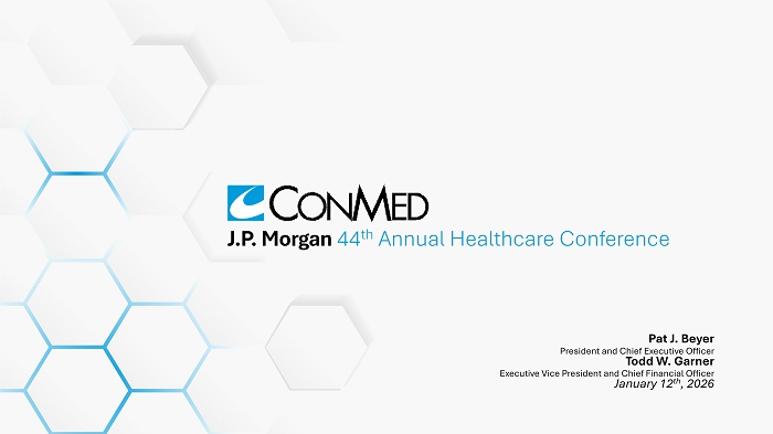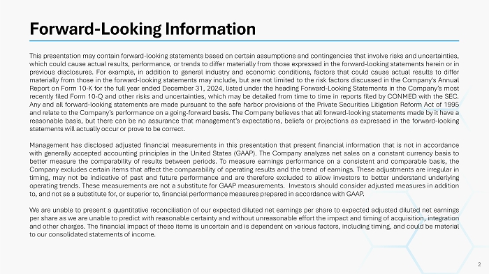 Forward - Looking Information This presentation may contain forward - looking statements based on certain assumptions and contingencies that involve risks and uncertainties, which could cause actual results, performance, or trends to differ materially from those expressed in the forward - looking statements herein or in previous disclosures . For example, in addition to general industry and economic conditions, factors that could cause actual results to differ materially from those in the forward - looking statements may include, but are not limited to the risk factors discussed in the Company's Annual Report on Form 10 - K for the full year ended December 31 , 2024 , listed under the heading Forward - Looking Statements in the Company’s most recently filed Form 10 - Q and other risks and uncertainties, which may be detailed from time to time in reports filed by CONMED with the SEC . Any and all forward - looking statements are made pursuant to the safe harbor provisions of the Private Securities Litigation Reform Act of 1995 and relate to the Company’s performance on a going - forward basis . The Company believes that all forward - looking statements made by it have a reasonable basis, but there can be no assurance that management’s expectations, beliefs or projections as expressed in the forward - looking statements will actually occur or prove to be correct . Management has disclosed adjusted financial measurements in this presentation that present financial information that is not in accordance with generally accepted accounting principles in the United States (GAAP) . The Company analyzes net sales on a constant currency basis to better measure the comparability of results between periods . To measure earnings performance on a consistent and comparable basis, the Company excludes certain items that affect the comparability of operating results and the trend of earnings . These adjustments are irregular in timing, may not be indicative of past and future performance and are therefore excluded to allow investors to better understand underlying operating trends . These measurements are not a substitute for GAAP measurements . Investors should consider adjusted measures in addition to, and not as a substitute for, or superior to, financial performance measures prepared in accordance with GAAP . We are unable to present a quantitative reconciliation of our expected diluted net earnings per share to expected adjusted diluted net earnings per share as we are unable to predict with reasonable certainty and without unreasonable effort the impact and timing of acquisition, integration and other charges . The financial impact of these items is uncertain and is dependent on various factors, including timing, and could be material to our consolidated statements of income . 2