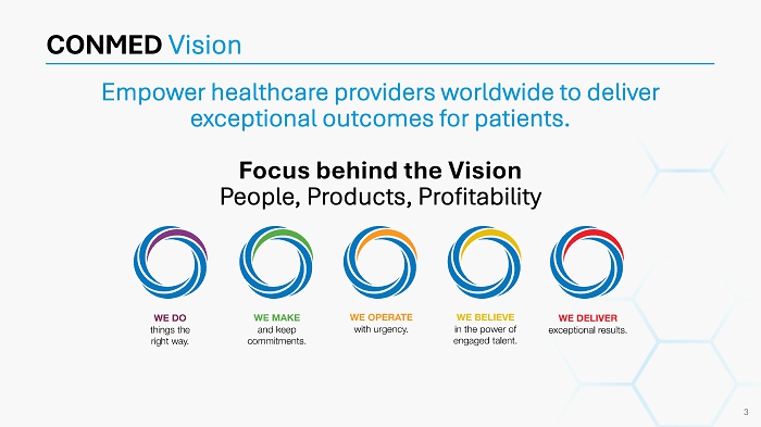 Empower healthcare providers worldwide to deliver exceptional outcomes for patients. Focus behind the Vision People, Products, Profitability CONMED Vision 3