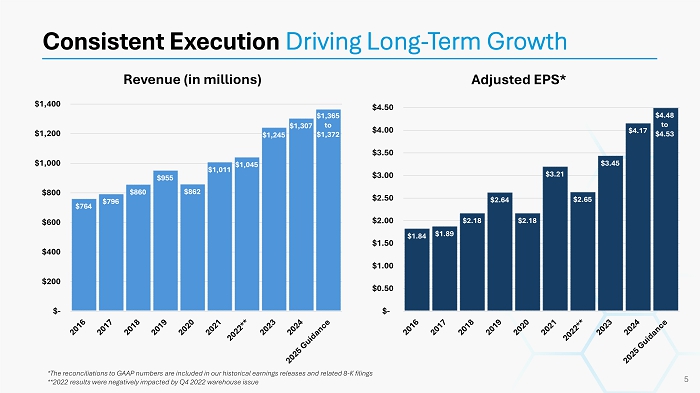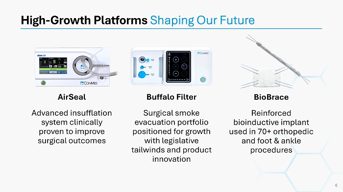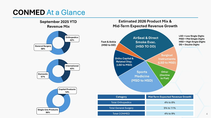 CONMED At a Glance September 2025 YTD Revenue Mix Sports Medicine (MSD to HSD) Ortho Capital & Related Disp. (LSD to MSD) Foot & Ankle (HSD to DD) AirSeal & Direct Smoke Evac. (HSD TO DD) Surgical Instruments (LSD to MSD) Other (Decline to Flat) Estimated 2026 Product Mix & Mid - Term Expected Revenue Growth LSD = Low Single Digits MSD = Mid Single Digits HSD = High Single Digits DD = Double Digits Mid - Term Expected Revenue Growth Category 4% to 8% Total Orthopedics 5% to 11% Total General Surgery 4% to 9% Total CONMED 4 Orthopedics 42% General Surgery 58% International 43% Domestic 57% Capital Products 14% Single - Use Products 86%