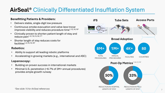 AirSeal Advanced insufflation system clinically proven to improve surgical outcomes Buffalo Filter Surgical smoke evacuation portfolio positioned for growth with legislative tailwinds and product innovation BioBrace Reinforced bioinductive implant used in 70+ orthopedic and foot & ankle procedures High - Growth Platforms Shaping Our Future 6