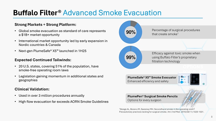 Strong Markets + Strong Platform: • Global smoke evacuation as standard of care represents a $1B+ market opportunity • International market opportunity led by early expansion in Nordic countries & Canada • Next - gen PlumeSafe ® X5 launched in 1H25 Expected Continued Tailwinds: • 20 U.S. states, covering 51% of the population, have smoke - free operating room laws • Legislation gaining momentum in additional states and geographies Clinical Validation: • Used in over 3 million procedures annually • High flow evacuation far exceeds AORN Smoke Guidelines Buffalo Filter® Advanced Smoke Evacuation OPTIONS FOR EVERY SURGEON 1 Steege AL, Boiano JM, Sweeney MH. Secondhand smoke in the operating room? Precautionary practices lacking for surgical smoke. Am J Ind Med. 2016;59(11):1020 - 1031. 8 Percentage of surgical procedures that create smoke 1 90% Efficacy against toxic smoke when using Buffalo Filter’s proprietary filtration technology 99% PlumeSafe ® X5 Smoke Evacuator Enhanced efficiency and safety PlumePen ® Surgical Smoke Pencils Options for every surgeon