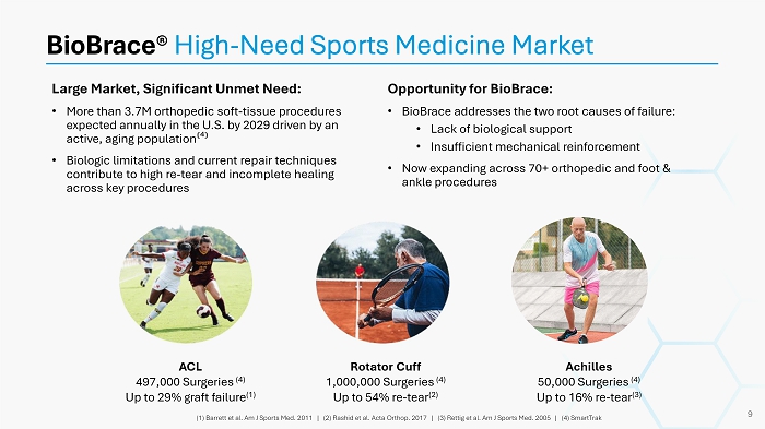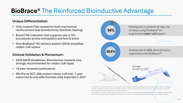 Large Market, Significant Unmet Need: • More than 3.7M orthopedic soft - tissue procedures expected annually in the U.S. by 2029 driven by an active, aging population ⁽ ⁴ ⁾ • Biologic limitations and current repair techniques contribute to high re - tear and incomplete healing across key procedures BioBrace® High - Need Sports Medicine Market (1) Barrett et al. Am J Sports Med. 2011 | (2) Rashid et al. Acta Orthop . 2017 | (3) Rettig et al. Am J Sports Med. 2005 | (4) SmartTrak 9 Opportunity for BioBrace : • BioBrace addresses the two root causes of failure: • Lack of biological support • Insufficient mechanical reinforcement • Now expanding across 70+ orthopedic and foot & ankle procedures ACL 497,000 Surgeries (4) Up to 29% graft failure (1) Rotator Cuff 1,000,000 Surgeries (4) Up to 54% re - tear (2) Achilles 50,000 Surgeries (4) Up to 16% re - tear (3)
