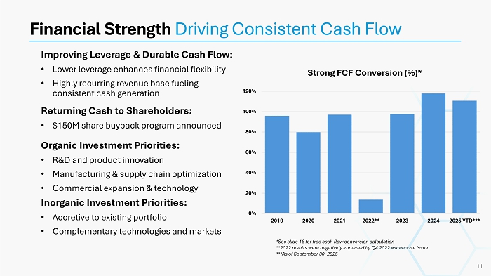 Organic Investment Priorities: • R&D and product innovation • Manufacturing & supply chain optimization • Commercial expansion & technology Inorganic Investment Priorities: • Accretive to existing portfolio • Complementary technologies and markets Improving Leverage & Durable Cash Flow: • Lower leverage enhances financial flexibility • Highly recurring revenue base fueling consistent cash generation Returning Cash to Shareholders: • $150M share buyback program announced Financial Strength Driving Consistent Cash Flow Strong FCF Conversion (%)* 11 0% 20% 40% 60% 80% 100% 120% 2019 2020 2021 2022** 2023 2024 2025 YTD*** *See slide 16 for free cash flow conversion calculation **2022 results were negatively impacted by Q4 2022 warehouse issue ***As of September 30, 2025