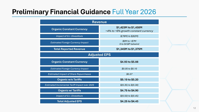 Preliminary Financial Guidance Full Year 2026 Revenue $1,423M to $1,450M ~4% to ~6% growth constant currency Organic Constant Currency $(78M) to $(82M) Impact of G.I. Divestiture $0M to ~$7M 0 to 50 BP tailwind Estimated Foreign Currency Impact $1,345M to $1,375M Total Reported Revenue Adjusted EPS $4.93 to $5.08 Organic Constant Currency $0.05 to $0.10 Estimated Foreign Currency Impact $0.07 Estimated Impact of Share Repurchases $5.10 to $5.20 Organic w/o Tariffs $(0.35) to $(0.30) Estimated Incremental Tariff Impact over 2025 $4.75 to $4.90 Organic w/ Tariffs $(0.50) to $(0.45) Impact of G.I. Divestiture $4.25 to $4.45 Total Adjusted EPS 12