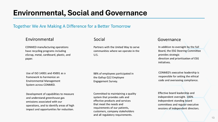 Partners with the United Way to serve communities where we operate in the U.S. CONMED manufacturing operations have recycling programs including eScrap , metal, cardboard, plastic, and paper. Effective board leadership and independent oversight. 100% independent standing board committees and regular executive sessions of independent directors. Together We Are Making A Difference for a Better Tomorrow Environmental Social Governance 98% of employees participated in the Gallup Q12 Employee Engagement Survey. Committed to maintaining a quality system that provides safe and effective products and services that meet the needs and requirements of our patients, customers, company stakeholders and all regulatory requirements. Use of ISO 14001 and 45001 as a framework to harmonize an Environmental Management System across CONMED. Development of capabilities to measure and understand greenhouse gas emissions associated with our operations, and to identify areas of high impact and opportunities for reduction. CONMED’s executive leadership is responsible for setting the ethical code and overseeing compliance. In addition to oversight by the full Board, the ESG Steering Committee provides strategic direction and prioritization of ESG initiatives. Environmental, Social and Governance 13