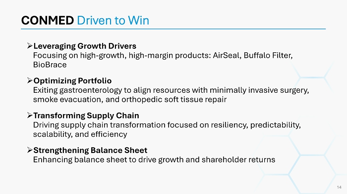 » Leveraging Growth Drivers Focusing on high - growth, high - margin products: AirSeal , Buffalo Filter, BioBrace » Optimizing Portfolio Exiting gastroenterology to align resources with minimally invasive surgery, smoke evacuation, and orthopedic soft tissue repair » Transforming Supply Chain Driving supply chain transformation focused on resiliency, predictability, scalability, and efficiency » Strengthening Balance Sheet Enhancing balance sheet to drive growth and shareholder returns CONMED Driven to Win 14