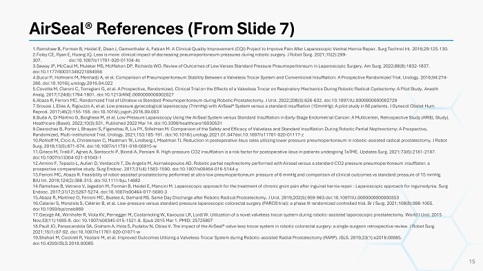 AirSeal ® References (From Slide 7) 1.Ramshaw B, Forman B, Heidel E, Dean J, Gamenthaler A, Fabian M. A Clinical Quality Improvement (CQI) Project to Improve Pain After Laparoscopic Ventral Hernia Repair. Surg Tech no l Int. 2016;29:125 - 130. 2.Foley CE, Ryan E, Huang JQ. Less is more: clinical impact of decreasing pneumoperitoneum pressures during robotic surgery. J R obot Surg. 2021;15(2):299 - 307. doi:10.1007/s11701 - 020 - 01104 - 4c 3.Saway JP, McCaul M, Mulekar MS, McMahon DP, Richards WO. Review of Outcomes of Low Verses Standard Pressure Pneumoperitoneu m i n Laparoscopic Surgery. Am Surg. 2022;88(8):1832 - 1837. doi:10.1177/00031348221084956 4.Bucur P, Hofmann M, Menhadji A, et al. Comparison of Pneumoperitoneum Stability Between a Valveless Trocar System and Conventional Insufflation: A Prospec ti ve Randomized Trial. Urology. 2016;94:274 - 280. doi:10.1016/j.urology.2016.04.022 5.Covotta M, Claroni C, Torregiani G, et al. A Prospective, Randomized, Clinical Trial on the Effects of a Valveless Trocar on Respiratory Mechani cs During Robotic Radical Cystectomy: A Pilot Study. Anesth Analg . 2017;124(6):1794 - 1801. doi:10.1213/ANE.0000000000002027 6.Abaza R, Ferroni MC. Randomized Trial of Ultralow vs Standard Pneumoperitoneum during Robotic Prostatectomy. J Urol. 2022;2 08( 3):626 - 632. doi:10.1097/JU.0000000000002729 7.Sroussi J, Elies A, Rigouzzo A, et al. Low pressure gynecological laparoscopy (7mmHg) with AirSeal ® System versus a standard insufflation (15mmHg): A pilot study in 60 patients. J Gynecol Obstet Hum Reprod . 2017;46(2):155 - 158. doi:10.1016/j.jogoh.2016.09.003 8.Buda A, Di Martino G, Borghese M, et al. Low - Pressure Laparoscopy Using the AirSeal System versus Standard Insufflation in Early - Stage Endometrial Cancer: A Multicenter, Retrospective Study (ARIEL Study). Healthcare (Basel). 2022;10(3):531. Published 2022 Mar 14. doi:10.3390/healthcare10030531 9.Desroches B, Porter J, Bhayani S, Figenshau R, Liu PY, Stifelman M. Comparison of the Safety and Efficacy of Valveless and Standard Insufflation During Robotic Partial N ep hrectomy: A Prospective, Randomized, Multi - institutional Trial. Urology. 2021;153:185 - 191. doi:10.1016/j.urology.2021.01.047doi:10.1007/s11701 - 020 - 01117 - z 10.Rohloff M, Cicic A, Christensen C, Maatman TK, Lindberg J, Maatman TJ. Reduction in postoperative ileus rates utilizing lo wer pressure pneumoperitoneum in robotic - assisted radical prostatectomy. J Robot Surg. 2019;13(5):671 - 674. doi:10.1007/s11701 - 018 - 00915 - w 11.Grieco M, Tirelli F, Agnes A, Santocchi P, Biondi A, Persiani R. High - pressure CO2 insufflation is a risk factor for postoperative ileus in patients undergoing TaTME . Updates Surg. 2021;73(6):2181 - 2187. doi:10.1007/s13304 - 021 - 01043 - 1 12.Annino F, Topazio L, Autieri D, Verdacchi T, De Angelis M, Asimakopoulos AD. Robotic partial nephrectomy performed with Airseal versus a standard CO2 pressure pneumoperitoneum insufflator: a prospective comparative study. Surg Endosc . 2017;31(4):1583 - 1590. doi:10.1007/s00464 - 016 - 5144 - y 13.Ferroni MC, Abaza R. Feasibility of robot - assisted prostatectomy performed at ultra - low pneumoperitoneum pressure of 6 mmHg a nd comparison of clinical outcomes vs standard pressure of 15 mmHg. BJU Int. 2019;124(2):308 - 313. doi:10.1111/bju.14682 14.Ramshaw B, Vetrano V, Jagadish M, Forman B, Heidel E, Mancini M. Laparoscopic approach for the treatment of chronic groin pai n after inguinal hernia repair : Laparoscopic approach for inguinodynia . Surg Endosc . 2017;31(12):5267 - 5274. doi:10.1007/s00464 - 017 - 5600 - 3 15.Abaza R, Martinez O, Ferroni MC, Bsatee A, Gerhard RS. Same Day Discharge after Robotic Radical Prostatectomy. J Urol. 2019;202(5):959 - 963.doi:10.1097/JU.0000000000000 353 16.Celarier S, Monziols S, Célérier B, et al. Low - pressure versus standard pressure laparoscopic colorectal surgery (PAROS trial): a phase III randomized controlle d trial. Br J Surg. 2021;108(8):998 - 1005. doi:10.1093/ bjs /znab069 17.George AK, Wimhofer R, Viola KV, Pernegger M, Costamoling W, Kavoussi LR, Loidl W. Utilization of a novel valveless trocar system during robotic - assisted laparoscopic prostatectomy. Wor ld J Urol. 2015 Nov;33(11):1695 - 9. doi : 10.1007/s00345 - 015 - 1521 - 8. Epub 2015 Mar 1. PMID: 25725807 18.Paull JO, Parsacandola SA, Graham A, Hota S, Pudalov N, Obias V. The impact of the AirSeal ® valve - less trocar system in robotic colorectal surgery: a single - surgeon retrospective review. J Robot Surg. 2021;15(1):87 - 92. doi:10.1007/s11701 - 020 - 01071 - w 19.Shahait M, Cockrell R, Yezdani M, et al. Improved Outcomes Utilizing a Valveless - Trocar System during Robotic - assisted Radial Prostatectomy (RARP). JSLS. 2019 ;23(1):e2018.00085. doi:10.4293/JSLS.2018.00085 15