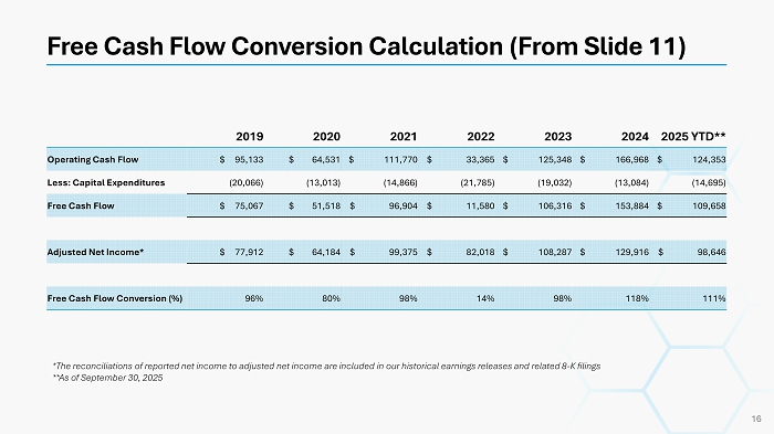 Free Cash Flow Conversion Calculation (From Slide 11) 16 2025 YTD** 2024 2023 2022 2021 2020 2019 $ 124,353 $ 166,968 $ 125,348 $ 33,365 $ 111,770 $ 64,531 $ 95,133 Operating Cash Flow (14,695) (13,084) (19,032) (21,785) (14,866) (13,013) (20,066) Less: Capital Expenditures $ 109,658 $ 153,884 $ 106,316 $ 11,580 $ 96,904 $ 51,518 $ 75,067 Free Cash Flow $ 98,646 $ 129,916 $ 108,287 $ 82,018 $ 99,375 $ 64,184 $ 77,912 Adjusted Net Income* 111% 118% 98% 14% 98% 80% 96% Free Cash Flow Conversion (%) *The reconciliations of reported net income to adjusted net income are included in our historical earnings releases and relat ed 8 - K filings **As of September 30, 2025