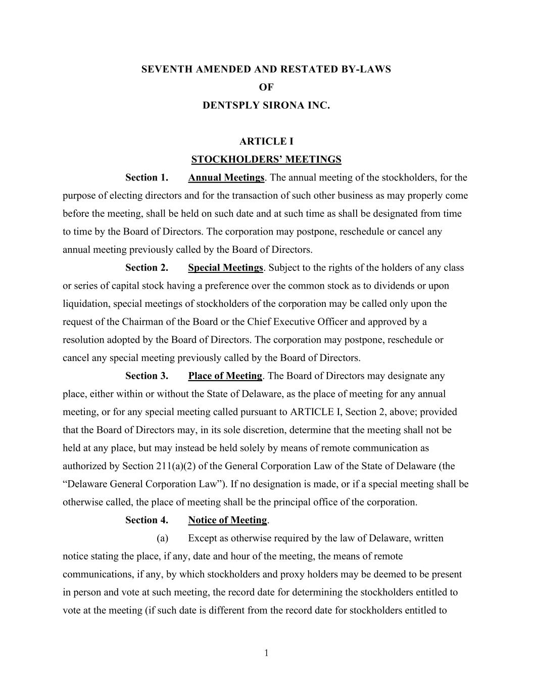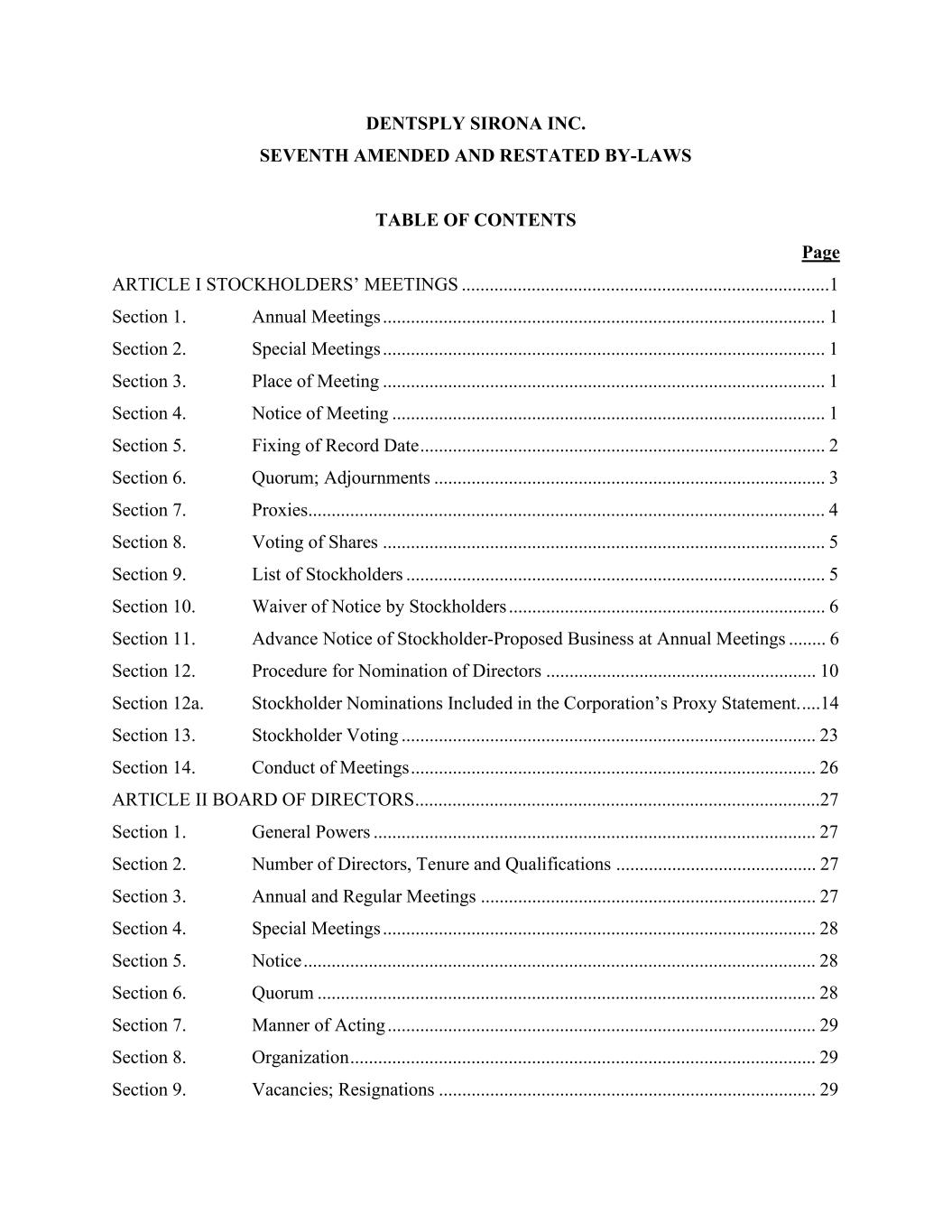 DENTSPLY SIRONA INC. SEVENTH AMENDED AND RESTATED BY-LAWS TABLE OF CONTENTS Page ARTICLE I STOCKHOLDERS’ MEETINGS ...............................................................................1 Section 1. Annual Meetings ............................................................................................... 1 Section 2. Special Meetings ............................................................................................... 1 Section 3. Place of Meeting ............................................................................................... 1 Section 4. Notice of Meeting ............................................................................................. 1 Section 5. Fixing of Record Date ....................................................................................... 2 Section 6. Quorum; Adjournments .................................................................................... 3 Section 7. Proxies............................................................................................................... 4 Section 8. Voting of Shares ............................................................................................... 5 Section 9. List of Stockholders .......................................................................................... 5 Section 10. Waiver of Notice by Stockholders .................................................................... 6 Section 11. Advance Notice of Stockholder-Proposed Business at Annual Meetings ........ 6 Section 12. Procedure for Nomination of Directors .......................................................... 10 Section 12a. Stockholder Nominations Included in the Corporation’s Proxy Statement. ....14 Section 13. Stockholder Voting ......................................................................................... 23 Section 14. Conduct of Meetings ....................................................................................... 26 ARTICLE II BOARD OF DIRECTORS .......................................................................................27 Section 1. General Powers ............................................................................................... 27 Section 2. Number of Directors, Tenure and Qualifications ........................................... 27 Section 3. Annual and Regular Meetings ........................................................................ 27 Section 4. Special Meetings ............................................................................................. 28 Section 5. Notice .............................................................................................................. 28 Section 6. Quorum ........................................................................................................... 28 Section 7. Manner of Acting ............................................................................................ 29 Section 8. Organization .................................................................................................... 29 Section 9. Vacancies; Resignations ................................................................................. 29
