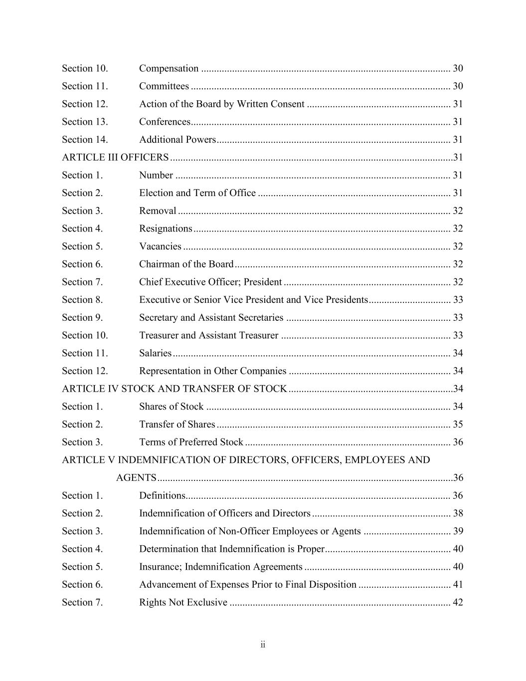 ii Section 10. Compensation ................................................................................................. 30 Section 11. Committees ..................................................................................................... 30 Section 12. Action of the Board by Written Consent ........................................................ 31 Section 13. Conferences..................................................................................................... 31 Section 14. Additional Powers ........................................................................................... 31 ARTICLE III OFFICERS ..............................................................................................................31 Section 1. Number ........................................................................................................... 31 Section 2. Election and Term of Office ........................................................................... 31 Section 3. Removal .......................................................................................................... 32 Section 4. Resignations .................................................................................................... 32 Section 5. Vacancies ........................................................................................................ 32 Section 6. Chairman of the Board .................................................................................... 32 Section 7. Chief Executive Officer; President ................................................................. 32 Section 8. Executive or Senior Vice President and Vice Presidents ................................ 33 Section 9. Secretary and Assistant Secretaries ................................................................ 33 Section 10. Treasurer and Assistant Treasurer .................................................................. 33 Section 11. Salaries ............................................................................................................ 34 Section 12. Representation in Other Companies ............................................................... 34 ARTICLE IV STOCK AND TRANSFER OF STOCK ................................................................34 Section 1. Shares of Stock ............................................................................................... 34 Section 2. Transfer of Shares ........................................................................................... 35 Section 3. Terms of Preferred Stock ................................................................................ 36 ARTICLE V INDEMNIFICATION OF DIRECTORS, OFFICERS, EMPLOYEES AND AGENTS ...................................................................................................................36 Section 1. Definitions....................................................................................................... 36 Section 2. Indemnification of Officers and Directors ...................................................... 38 Section 3. Indemnification of Non-Officer Employees or Agents .................................. 39 Section 4. Determination that Indemnification is Proper ................................................. 40 Section 5. Insurance; Indemnification Agreements ......................................................... 40 Section 6. Advancement of Expenses Prior to Final Disposition .................................... 41 Section 7. Rights Not Exclusive ...................................................................................... 42