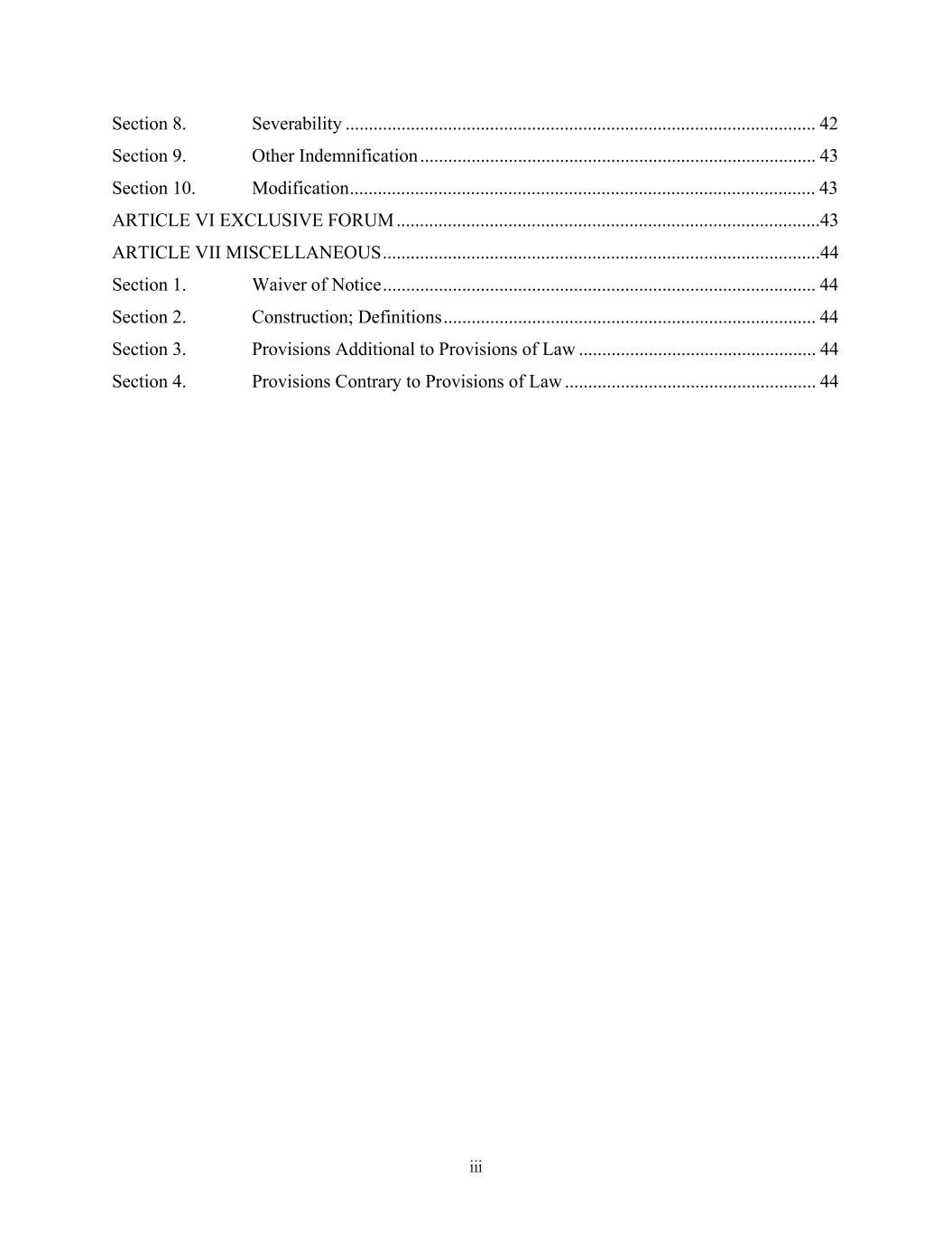 iii Section 8. Severability ..................................................................................................... 42 Section 9. Other Indemnification ..................................................................................... 43 Section 10. Modification .................................................................................................... 43 ARTICLE VI EXCLUSIVE FORUM ...........................................................................................43 ARTICLE VII MISCELLANEOUS ..............................................................................................44 Section 1. Waiver of Notice ............................................................................................. 44 Section 2. Construction; Definitions ................................................................................ 44 Section 3. Provisions Additional to Provisions of Law ................................................... 44 Section 4. Provisions Contrary to Provisions of Law ...................................................... 44