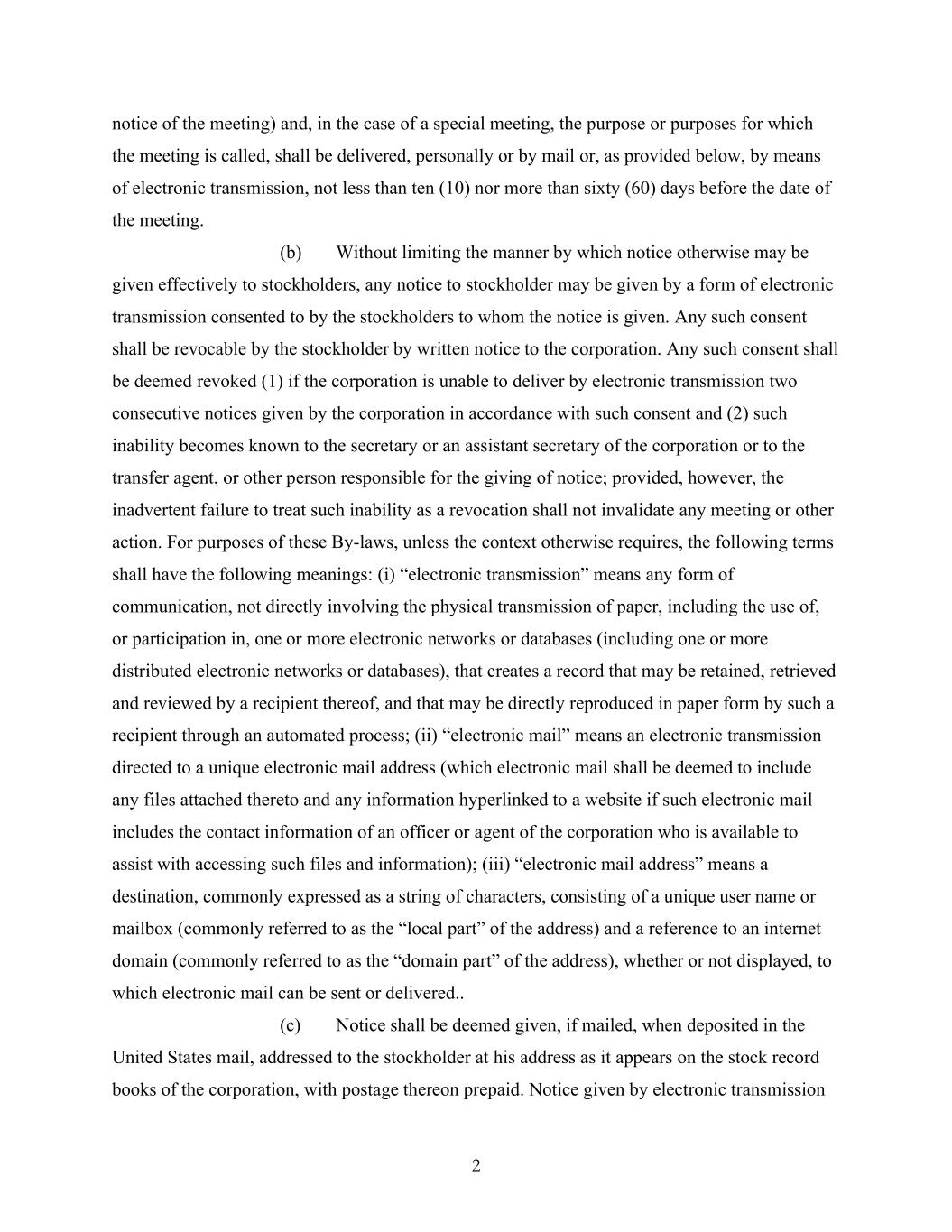 2 notice of the meeting) and, in the case of a special meeting, the purpose or purposes for which the meeting is called, shall be delivered, personally or by mail or, as provided below, by means of electronic transmission, not less than ten (10) nor more than sixty (60) days before the date of the meeting. (b) Without limiting the manner by which notice otherwise may be given effectively to stockholders, any notice to stockholder may be given by a form of electronic transmission consented to by the stockholders to whom the notice is given. Any such consent shall be revocable by the stockholder by written notice to the corporation. Any such consent shall be deemed revoked (1) if the corporation is unable to deliver by electronic transmission two consecutive notices given by the corporation in accordance with such consent and (2) such inability becomes known to the secretary or an assistant secretary of the corporation or to the transfer agent, or other person responsible for the giving of notice; provided, however, the inadvertent failure to treat such inability as a revocation shall not invalidate any meeting or other action. For purposes of these By-laws, unless the context otherwise requires, the following terms shall have the following meanings: (i) “electronic transmission” means any form of communication, not directly involving the physical transmission of paper, including the use of, or participation in, one or more electronic networks or databases (including one or more distributed electronic networks or databases), that creates a record that may be retained, retrieved and reviewed by a recipient thereof, and that may be directly reproduced in paper form by such a recipient through an automated process; (ii) “electronic mail” means an electronic transmission directed to a unique electronic mail address (which electronic mail shall be deemed to include any files attached thereto and any information hyperlinked to a website if such electronic mail includes the contact information of an officer or agent of the corporation who is available to assist with accessing such files and information); (iii) “electronic mail address” means a destination, commonly expressed as a string of characters, consisting of a unique user name or mailbox (commonly referred to as the “local part” of the address) and a reference to an internet domain (commonly referred to as the “domain part” of the address), whether or not displayed, to which electronic mail can be sent or delivered.. (c) Notice shall be deemed given, if mailed, when deposited in the United States mail, addressed to the stockholder at his address as it appears on the stock record books of the corporation, with postage thereon prepaid. Notice given by electronic transmission