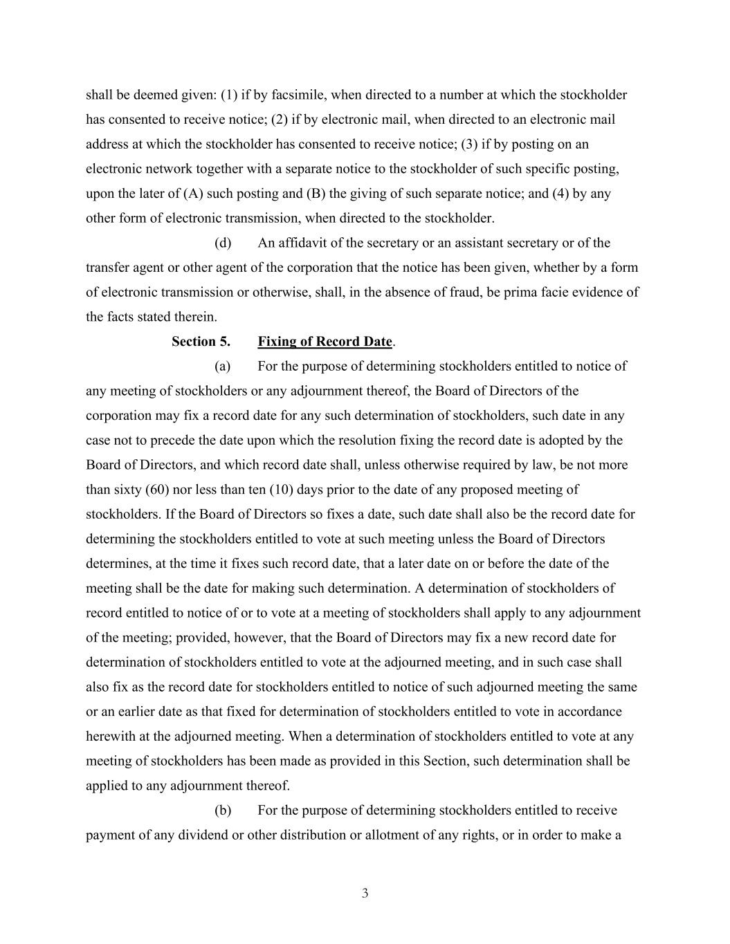3 shall be deemed given: (1) if by facsimile, when directed to a number at which the stockholder has consented to receive notice; (2) if by electronic mail, when directed to an electronic mail address at which the stockholder has consented to receive notice; (3) if by posting on an electronic network together with a separate notice to the stockholder of such specific posting, upon the later of (A) such posting and (B) the giving of such separate notice; and (4) by any other form of electronic transmission, when directed to the stockholder. (d) An affidavit of the secretary or an assistant secretary or of the transfer agent or other agent of the corporation that the notice has been given, whether by a form of electronic transmission or otherwise, shall, in the absence of fraud, be prima facie evidence of the facts stated therein. Section 5. Fixing of Record Date. (a) For the purpose of determining stockholders entitled to notice of any meeting of stockholders or any adjournment thereof, the Board of Directors of the corporation may fix a record date for any such determination of stockholders, such date in any case not to precede the date upon which the resolution fixing the record date is adopted by the Board of Directors, and which record date shall, unless otherwise required by law, be not more than sixty (60) nor less than ten (10) days prior to the date of any proposed meeting of stockholders. If the Board of Directors so fixes a date, such date shall also be the record date for determining the stockholders entitled to vote at such meeting unless the Board of Directors determines, at the time it fixes such record date, that a later date on or before the date of the meeting shall be the date for making such determination. A determination of stockholders of record entitled to notice of or to vote at a meeting of stockholders shall apply to any adjournment of the meeting; provided, however, that the Board of Directors may fix a new record date for determination of stockholders entitled to vote at the adjourned meeting, and in such case shall also fix as the record date for stockholders entitled to notice of such adjourned meeting the same or an earlier date as that fixed for determination of stockholders entitled to vote in accordance herewith at the adjourned meeting. When a determination of stockholders entitled to vote at any meeting of stockholders has been made as provided in this Section, such determination shall be applied to any adjournment thereof. (b) For the purpose of determining stockholders entitled to receive payment of any dividend or other distribution or allotment of any rights, or in order to make a