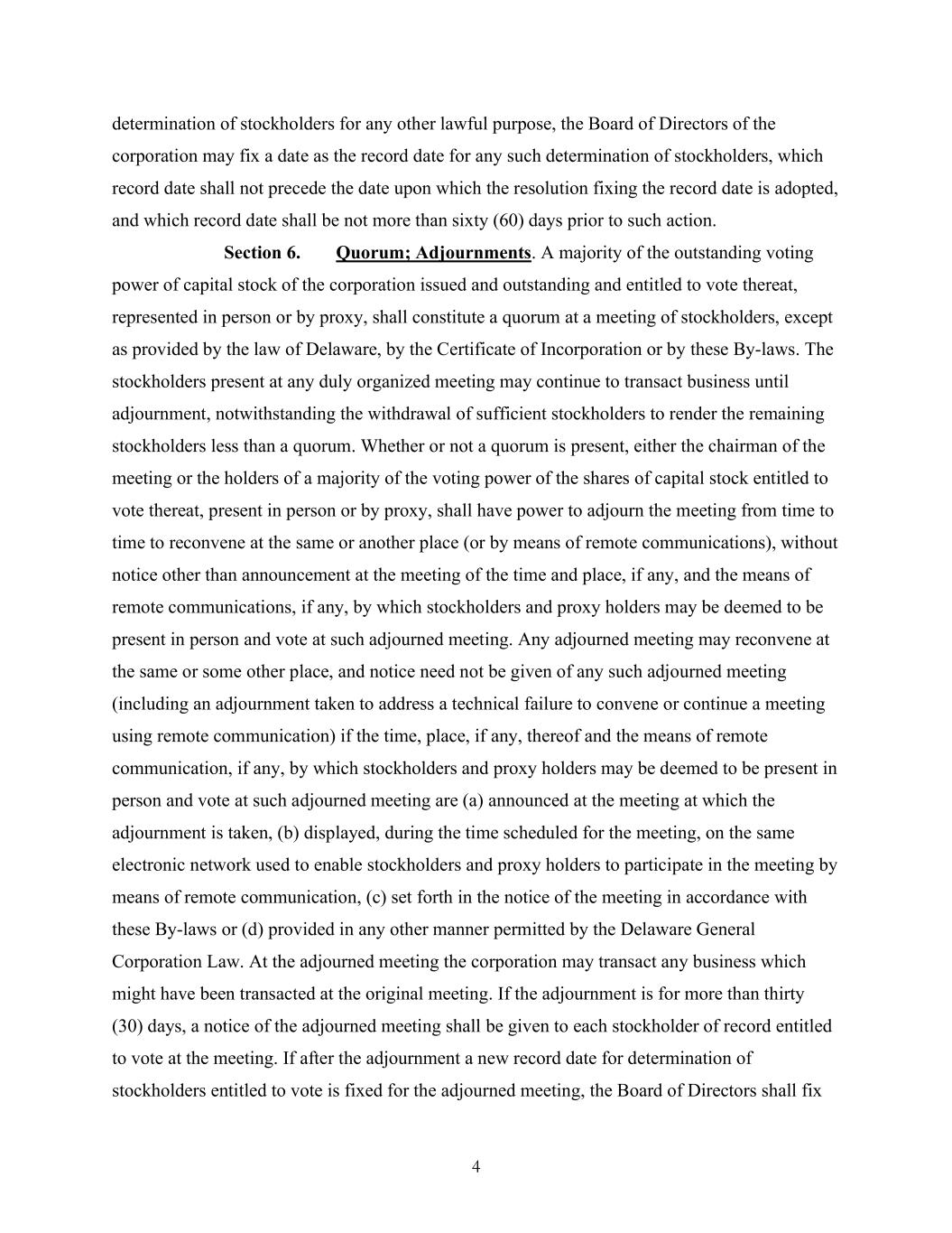 4 determination of stockholders for any other lawful purpose, the Board of Directors of the corporation may fix a date as the record date for any such determination of stockholders, which record date shall not precede the date upon which the resolution fixing the record date is adopted, and which record date shall be not more than sixty (60) days prior to such action. Section 6. Quorum; Adjournments. A majority of the outstanding voting power of capital stock of the corporation issued and outstanding and entitled to vote thereat, represented in person or by proxy, shall constitute a quorum at a meeting of stockholders, except as provided by the law of Delaware, by the Certificate of Incorporation or by these By-laws. The stockholders present at any duly organized meeting may continue to transact business until adjournment, notwithstanding the withdrawal of sufficient stockholders to render the remaining stockholders less than a quorum. Whether or not a quorum is present, either the chairman of the meeting or the holders of a majority of the voting power of the shares of capital stock entitled to vote thereat, present in person or by proxy, shall have power to adjourn the meeting from time to time to reconvene at the same or another place (or by means of remote communications), without notice other than announcement at the meeting of the time and place, if any, and the means of remote communications, if any, by which stockholders and proxy holders may be deemed to be present in person and vote at such adjourned meeting. Any adjourned meeting may reconvene at the same or some other place, and notice need not be given of any such adjourned meeting (including an adjournment taken to address a technical failure to convene or continue a meeting using remote communication) if the time, place, if any, thereof and the means of remote communication, if any, by which stockholders and proxy holders may be deemed to be present in person and vote at such adjourned meeting are (a) announced at the meeting at which the adjournment is taken, (b) displayed, during the time scheduled for the meeting, on the same electronic network used to enable stockholders and proxy holders to participate in the meeting by means of remote communication, (c) set forth in the notice of the meeting in accordance with these By-laws or (d) provided in any other manner permitted by the Delaware General Corporation Law. At the adjourned meeting the corporation may transact any business which might have been transacted at the original meeting. If the adjournment is for more than thirty (30) days, a notice of the adjourned meeting shall be given to each stockholder of record entitled to vote at the meeting. If after the adjournment a new record date for determination of stockholders entitled to vote is fixed for the adjourned meeting, the Board of Directors shall fix