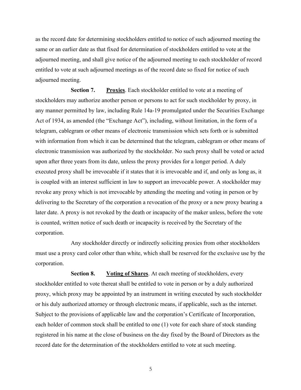 5 as the record date for determining stockholders entitled to notice of such adjourned meeting the same or an earlier date as that fixed for determination of stockholders entitled to vote at the adjourned meeting, and shall give notice of the adjourned meeting to each stockholder of record entitled to vote at such adjourned meetings as of the record date so fixed for notice of such adjourned meeting. Section 7. Proxies. Each stockholder entitled to vote at a meeting of stockholders may authorize another person or persons to act for such stockholder by proxy, in any manner permitted by law, including Rule 14a-19 promulgated under the Securities Exchange Act of 1934, as amended (the “Exchange Act”), including, without limitation, in the form of a telegram, cablegram or other means of electronic transmission which sets forth or is submitted with information from which it can be determined that the telegram, cablegram or other means of electronic transmission was authorized by the stockholder. No such proxy shall be voted or acted upon after three years from its date, unless the proxy provides for a longer period. A duly executed proxy shall be irrevocable if it states that it is irrevocable and if, and only as long as, it is coupled with an interest sufficient in law to support an irrevocable power. A stockholder may revoke any proxy which is not irrevocable by attending the meeting and voting in person or by delivering to the Secretary of the corporation a revocation of the proxy or a new proxy bearing a later date. A proxy is not revoked by the death or incapacity of the maker unless, before the vote is counted, written notice of such death or incapacity is received by the Secretary of the corporation. Any stockholder directly or indirectly soliciting proxies from other stockholders must use a proxy card color other than white, which shall be reserved for the exclusive use by the corporation. Section 8. Voting of Shares. At each meeting of stockholders, every stockholder entitled to vote thereat shall be entitled to vote in person or by a duly authorized proxy, which proxy may be appointed by an instrument in writing executed by such stockholder or his duly authorized attorney or through electronic means, if applicable, such as the internet. Subject to the provisions of applicable law and the corporation’s Certificate of Incorporation, each holder of common stock shall be entitled to one (1) vote for each share of stock standing registered in his name at the close of business on the day fixed by the Board of Directors as the record date for the determination of the stockholders entitled to vote at such meeting.