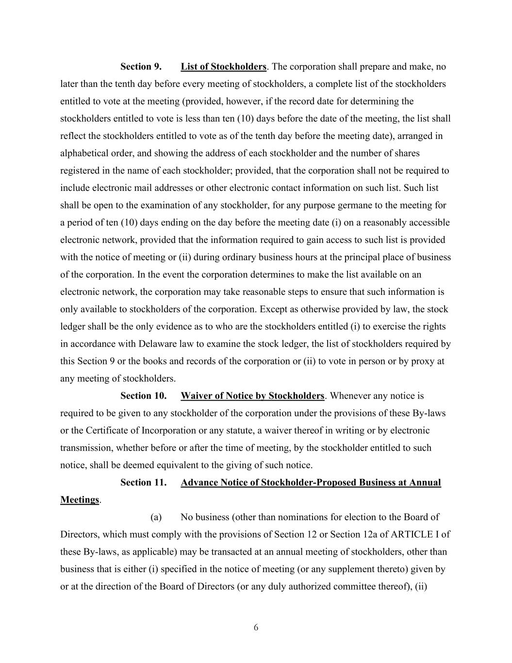 6 Section 9. List of Stockholders. The corporation shall prepare and make, no later than the tenth day before every meeting of stockholders, a complete list of the stockholders entitled to vote at the meeting (provided, however, if the record date for determining the stockholders entitled to vote is less than ten (10) days before the date of the meeting, the list shall reflect the stockholders entitled to vote as of the tenth day before the meeting date), arranged in alphabetical order, and showing the address of each stockholder and the number of shares registered in the name of each stockholder; provided, that the corporation shall not be required to include electronic mail addresses or other electronic contact information on such list. Such list shall be open to the examination of any stockholder, for any purpose germane to the meeting for a period of ten (10) days ending on the day before the meeting date (i) on a reasonably accessible electronic network, provided that the information required to gain access to such list is provided with the notice of meeting or (ii) during ordinary business hours at the principal place of business of the corporation. In the event the corporation determines to make the list available on an electronic network, the corporation may take reasonable steps to ensure that such information is only available to stockholders of the corporation. Except as otherwise provided by law, the stock ledger shall be the only evidence as to who are the stockholders entitled (i) to exercise the rights in accordance with Delaware law to examine the stock ledger, the list of stockholders required by this Section 9 or the books and records of the corporation or (ii) to vote in person or by proxy at any meeting of stockholders. Section 10. Waiver of Notice by Stockholders. Whenever any notice is required to be given to any stockholder of the corporation under the provisions of these By-laws or the Certificate of Incorporation or any statute, a waiver thereof in writing or by electronic transmission, whether before or after the time of meeting, by the stockholder entitled to such notice, shall be deemed equivalent to the giving of such notice. Section 11. Advance Notice of Stockholder-Proposed Business at Annual Meetings. (a) No business (other than nominations for election to the Board of Directors, which must comply with the provisions of Section 12 or Section 12a of ARTICLE I of these By-laws, as applicable) may be transacted at an annual meeting of stockholders, other than business that is either (i) specified in the notice of meeting (or any supplement thereto) given by or at the direction of the Board of Directors (or any duly authorized committee thereof), (ii)