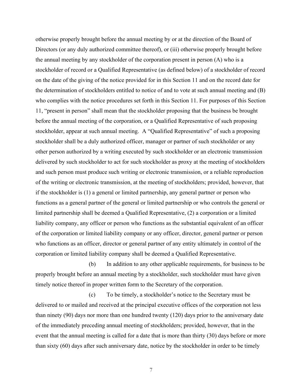 7 otherwise properly brought before the annual meeting by or at the direction of the Board of Directors (or any duly authorized committee thereof), or (iii) otherwise properly brought before the annual meeting by any stockholder of the corporation present in person (A) who is a stockholder of record or a Qualified Representative (as defined below) of a stockholder of record on the date of the giving of the notice provided for in this Section 11 and on the record date for the determination of stockholders entitled to notice of and to vote at such annual meeting and (B) who complies with the notice procedures set forth in this Section 11. For purposes of this Section 11, “present in person” shall mean that the stockholder proposing that the business be brought before the annual meeting of the corporation, or a Qualified Representative of such proposing stockholder, appear at such annual meeting. A “Qualified Representative” of such a proposing stockholder shall be a duly authorized officer, manager or partner of such stockholder or any other person authorized by a writing executed by such stockholder or an electronic transmission delivered by such stockholder to act for such stockholder as proxy at the meeting of stockholders and such person must produce such writing or electronic transmission, or a reliable reproduction of the writing or electronic transmission, at the meeting of stockholders; provided, however, that if the stockholder is (1) a general or limited partnership, any general partner or person who functions as a general partner of the general or limited partnership or who controls the general or limited partnership shall be deemed a Qualified Representative, (2) a corporation or a limited liability company, any officer or person who functions as the substantial equivalent of an officer of the corporation or limited liability company or any officer, director, general partner or person who functions as an officer, director or general partner of any entity ultimately in control of the corporation or limited liability company shall be deemed a Qualified Representative. (b) In addition to any other applicable requirements, for business to be properly brought before an annual meeting by a stockholder, such stockholder must have given timely notice thereof in proper written form to the Secretary of the corporation. (c) To be timely, a stockholder’s notice to the Secretary must be delivered to or mailed and received at the principal executive offices of the corporation not less than ninety (90) days nor more than one hundred twenty (120) days prior to the anniversary date of the immediately preceding annual meeting of stockholders; provided, however, that in the event that the annual meeting is called for a date that is more than thirty (30) days before or more than sixty (60) days after such anniversary date, notice by the stockholder in order to be timely