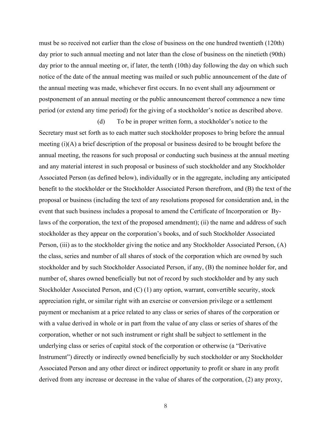 8 must be so received not earlier than the close of business on the one hundred twentieth (120th) day prior to such annual meeting and not later than the close of business on the ninetieth (90th) day prior to the annual meeting or, if later, the tenth (10th) day following the day on which such notice of the date of the annual meeting was mailed or such public announcement of the date of the annual meeting was made, whichever first occurs. In no event shall any adjournment or postponement of an annual meeting or the public announcement thereof commence a new time period (or extend any time period) for the giving of a stockholder’s notice as described above. (d) To be in proper written form, a stockholder’s notice to the Secretary must set forth as to each matter such stockholder proposes to bring before the annual meeting (i)(A) a brief description of the proposal or business desired to be brought before the annual meeting, the reasons for such proposal or conducting such business at the annual meeting and any material interest in such proposal or business of such stockholder and any Stockholder Associated Person (as defined below), individually or in the aggregate, including any anticipated benefit to the stockholder or the Stockholder Associated Person therefrom, and (B) the text of the proposal or business (including the text of any resolutions proposed for consideration and, in the event that such business includes a proposal to amend the Certificate of Incorporation or By- laws of the corporation, the text of the proposed amendment); (ii) the name and address of such stockholder as they appear on the corporation’s books, and of such Stockholder Associated Person, (iii) as to the stockholder giving the notice and any Stockholder Associated Person, (A) the class, series and number of all shares of stock of the corporation which are owned by such stockholder and by such Stockholder Associated Person, if any, (B) the nominee holder for, and number of, shares owned beneficially but not of record by such stockholder and by any such Stockholder Associated Person, and (C) (1) any option, warrant, convertible security, stock appreciation right, or similar right with an exercise or conversion privilege or a settlement payment or mechanism at a price related to any class or series of shares of the corporation or with a value derived in whole or in part from the value of any class or series of shares of the corporation, whether or not such instrument or right shall be subject to settlement in the underlying class or series of capital stock of the corporation or otherwise (a “Derivative Instrument”) directly or indirectly owned beneficially by such stockholder or any Stockholder Associated Person and any other direct or indirect opportunity to profit or share in any profit derived from any increase or decrease in the value of shares of the corporation, (2) any proxy,