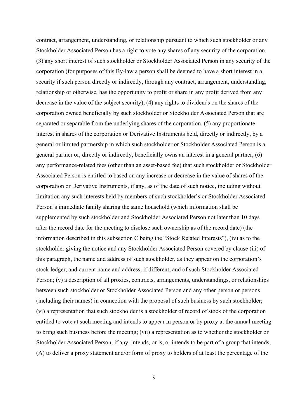 9 contract, arrangement, understanding, or relationship pursuant to which such stockholder or any Stockholder Associated Person has a right to vote any shares of any security of the corporation, (3) any short interest of such stockholder or Stockholder Associated Person in any security of the corporation (for purposes of this By-law a person shall be deemed to have a short interest in a security if such person directly or indirectly, through any contract, arrangement, understanding, relationship or otherwise, has the opportunity to profit or share in any profit derived from any decrease in the value of the subject security), (4) any rights to dividends on the shares of the corporation owned beneficially by such stockholder or Stockholder Associated Person that are separated or separable from the underlying shares of the corporation, (5) any proportionate interest in shares of the corporation or Derivative Instruments held, directly or indirectly, by a general or limited partnership in which such stockholder or Stockholder Associated Person is a general partner or, directly or indirectly, beneficially owns an interest in a general partner, (6) any performance-related fees (other than an asset-based fee) that such stockholder or Stockholder Associated Person is entitled to based on any increase or decrease in the value of shares of the corporation or Derivative Instruments, if any, as of the date of such notice, including without limitation any such interests held by members of such stockholder’s or Stockholder Associated Person’s immediate family sharing the same household (which information shall be supplemented by such stockholder and Stockholder Associated Person not later than 10 days after the record date for the meeting to disclose such ownership as of the record date) (the information described in this subsection C being the “Stock Related Interests”), (iv) as to the stockholder giving the notice and any Stockholder Associated Person covered by clause (iii) of this paragraph, the name and address of such stockholder, as they appear on the corporation’s stock ledger, and current name and address, if different, and of such Stockholder Associated Person; (v) a description of all proxies, contracts, arrangements, understandings, or relationships between such stockholder or Stockholder Associated Person and any other person or persons (including their names) in connection with the proposal of such business by such stockholder; (vi) a representation that such stockholder is a stockholder of record of stock of the corporation entitled to vote at such meeting and intends to appear in person or by proxy at the annual meeting to bring such business before the meeting; (vii) a representation as to whether the stockholder or Stockholder Associated Person, if any, intends, or is, or intends to be part of a group that intends, (A) to deliver a proxy statement and/or form of proxy to holders of at least the percentage of the