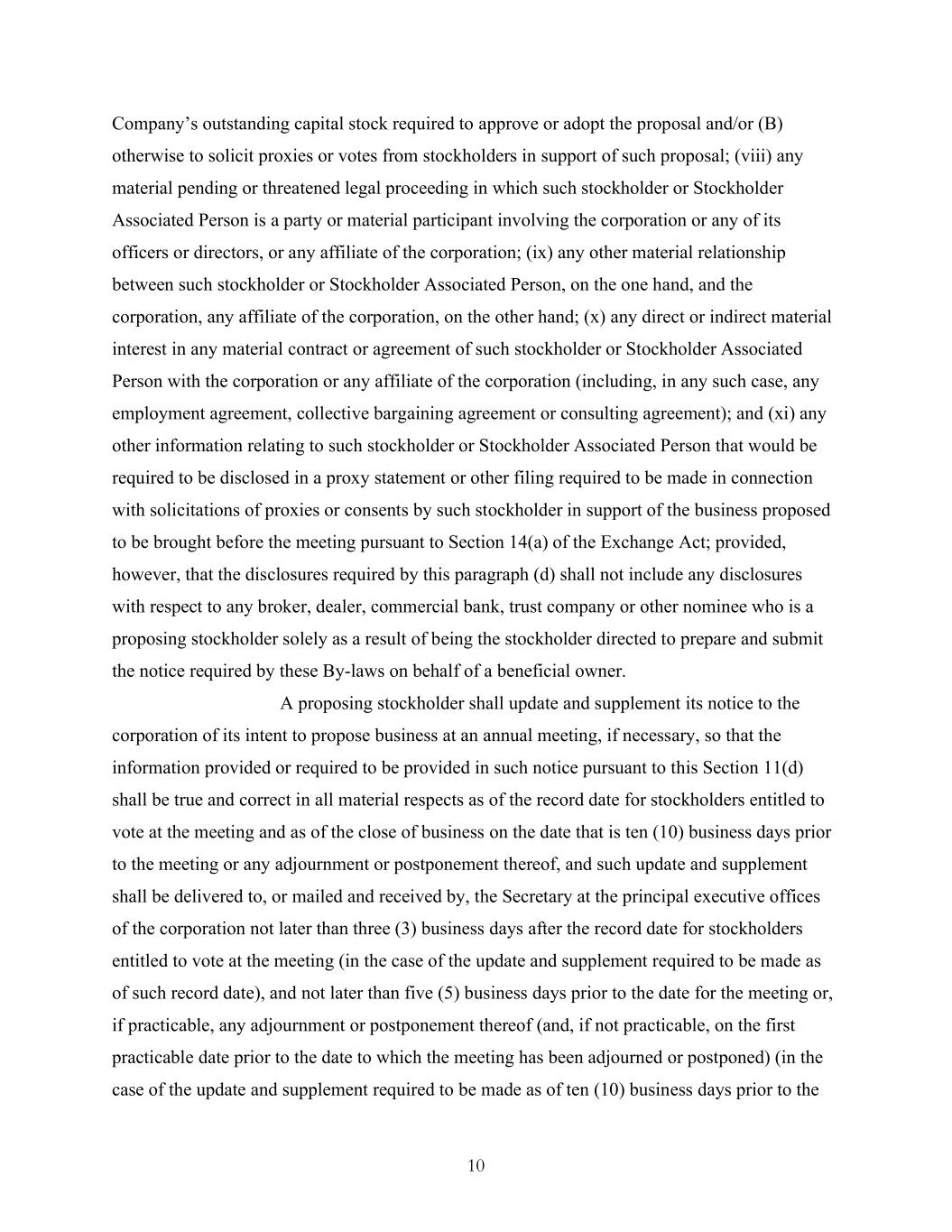 10 Company’s outstanding capital stock required to approve or adopt the proposal and/or (B) otherwise to solicit proxies or votes from stockholders in support of such proposal; (viii) any material pending or threatened legal proceeding in which such stockholder or Stockholder Associated Person is a party or material participant involving the corporation or any of its officers or directors, or any affiliate of the corporation; (ix) any other material relationship between such stockholder or Stockholder Associated Person, on the one hand, and the corporation, any affiliate of the corporation, on the other hand; (x) any direct or indirect material interest in any material contract or agreement of such stockholder or Stockholder Associated Person with the corporation or any affiliate of the corporation (including, in any such case, any employment agreement, collective bargaining agreement or consulting agreement); and (xi) any other information relating to such stockholder or Stockholder Associated Person that would be required to be disclosed in a proxy statement or other filing required to be made in connection with solicitations of proxies or consents by such stockholder in support of the business proposed to be brought before the meeting pursuant to Section 14(a) of the Exchange Act; provided, however, that the disclosures required by this paragraph (d) shall not include any disclosures with respect to any broker, dealer, commercial bank, trust company or other nominee who is a proposing stockholder solely as a result of being the stockholder directed to prepare and submit the notice required by these By-laws on behalf of a beneficial owner. A proposing stockholder shall update and supplement its notice to the corporation of its intent to propose business at an annual meeting, if necessary, so that the information provided or required to be provided in such notice pursuant to this Section 11(d) shall be true and correct in all material respects as of the record date for stockholders entitled to vote at the meeting and as of the close of business on the date that is ten (10) business days prior to the meeting or any adjournment or postponement thereof, and such update and supplement shall be delivered to, or mailed and received by, the Secretary at the principal executive offices of the corporation not later than three (3) business days after the record date for stockholders entitled to vote at the meeting (in the case of the update and supplement required to be made as of such record date), and not later than five (5) business days prior to the date for the meeting or, if practicable, any adjournment or postponement thereof (and, if not practicable, on the first practicable date prior to the date to which the meeting has been adjourned or postponed) (in the case of the update and supplement required to be made as of ten (10) business days prior to the