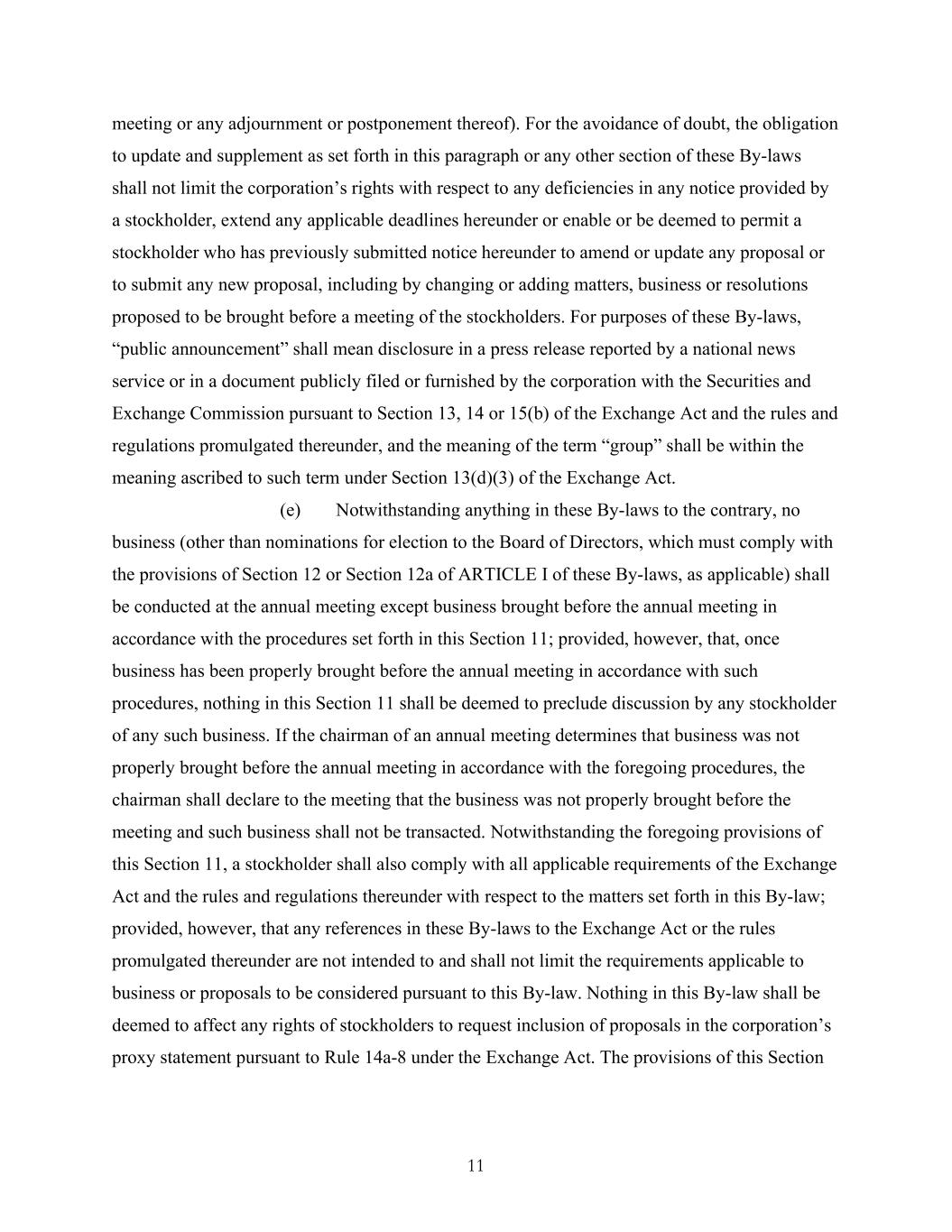 11 meeting or any adjournment or postponement thereof). For the avoidance of doubt, the obligation to update and supplement as set forth in this paragraph or any other section of these By-laws shall not limit the corporation’s rights with respect to any deficiencies in any notice provided by a stockholder, extend any applicable deadlines hereunder or enable or be deemed to permit a stockholder who has previously submitted notice hereunder to amend or update any proposal or to submit any new proposal, including by changing or adding matters, business or resolutions proposed to be brought before a meeting of the stockholders. For purposes of these By-laws, “public announcement” shall mean disclosure in a press release reported by a national news service or in a document publicly filed or furnished by the corporation with the Securities and Exchange Commission pursuant to Section 13, 14 or 15(b) of the Exchange Act and the rules and regulations promulgated thereunder, and the meaning of the term “group” shall be within the meaning ascribed to such term under Section 13(d)(3) of the Exchange Act. (e) Notwithstanding anything in these By-laws to the contrary, no business (other than nominations for election to the Board of Directors, which must comply with the provisions of Section 12 or Section 12a of ARTICLE I of these By-laws, as applicable) shall be conducted at the annual meeting except business brought before the annual meeting in accordance with the procedures set forth in this Section 11; provided, however, that, once business has been properly brought before the annual meeting in accordance with such procedures, nothing in this Section 11 shall be deemed to preclude discussion by any stockholder of any such business. If the chairman of an annual meeting determines that business was not properly brought before the annual meeting in accordance with the foregoing procedures, the chairman shall declare to the meeting that the business was not properly brought before the meeting and such business shall not be transacted. Notwithstanding the foregoing provisions of this Section 11, a stockholder shall also comply with all applicable requirements of the Exchange Act and the rules and regulations thereunder with respect to the matters set forth in this By-law; provided, however, that any references in these By-laws to the Exchange Act or the rules promulgated thereunder are not intended to and shall not limit the requirements applicable to business or proposals to be considered pursuant to this By-law. Nothing in this By-law shall be deemed to affect any rights of stockholders to request inclusion of proposals in the corporation’s proxy statement pursuant to Rule 14a-8 under the Exchange Act. The provisions of this Section