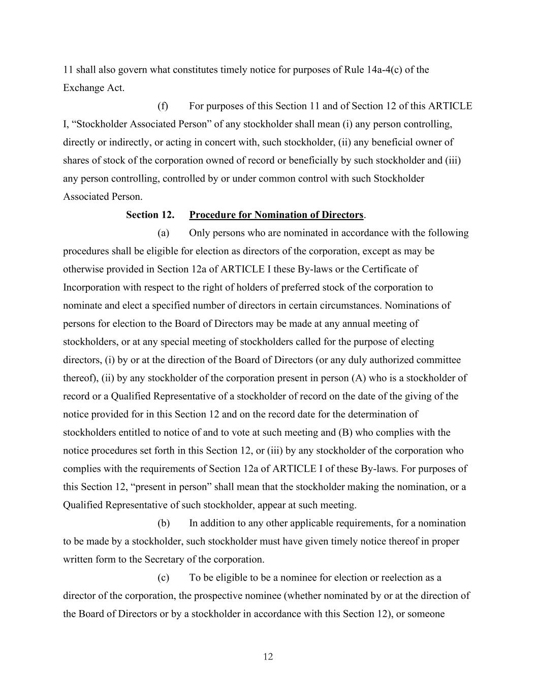 12 11 shall also govern what constitutes timely notice for purposes of Rule 14a-4(c) of the Exchange Act. (f) For purposes of this Section 11 and of Section 12 of this ARTICLE I, “Stockholder Associated Person” of any stockholder shall mean (i) any person controlling, directly or indirectly, or acting in concert with, such stockholder, (ii) any beneficial owner of shares of stock of the corporation owned of record or beneficially by such stockholder and (iii) any person controlling, controlled by or under common control with such Stockholder Associated Person. Section 12. Procedure for Nomination of Directors. (a) Only persons who are nominated in accordance with the following procedures shall be eligible for election as directors of the corporation, except as may be otherwise provided in Section 12a of ARTICLE I these By-laws or the Certificate of Incorporation with respect to the right of holders of preferred stock of the corporation to nominate and elect a specified number of directors in certain circumstances. Nominations of persons for election to the Board of Directors may be made at any annual meeting of stockholders, or at any special meeting of stockholders called for the purpose of electing directors, (i) by or at the direction of the Board of Directors (or any duly authorized committee thereof), (ii) by any stockholder of the corporation present in person (A) who is a stockholder of record or a Qualified Representative of a stockholder of record on the date of the giving of the notice provided for in this Section 12 and on the record date for the determination of stockholders entitled to notice of and to vote at such meeting and (B) who complies with the notice procedures set forth in this Section 12, or (iii) by any stockholder of the corporation who complies with the requirements of Section 12a of ARTICLE I of these By-laws. For purposes of this Section 12, “present in person” shall mean that the stockholder making the nomination, or a Qualified Representative of such stockholder, appear at such meeting. (b) In addition to any other applicable requirements, for a nomination to be made by a stockholder, such stockholder must have given timely notice thereof in proper written form to the Secretary of the corporation. (c) To be eligible to be a nominee for election or reelection as a director of the corporation, the prospective nominee (whether nominated by or at the direction of the Board of Directors or by a stockholder in accordance with this Section 12), or someone