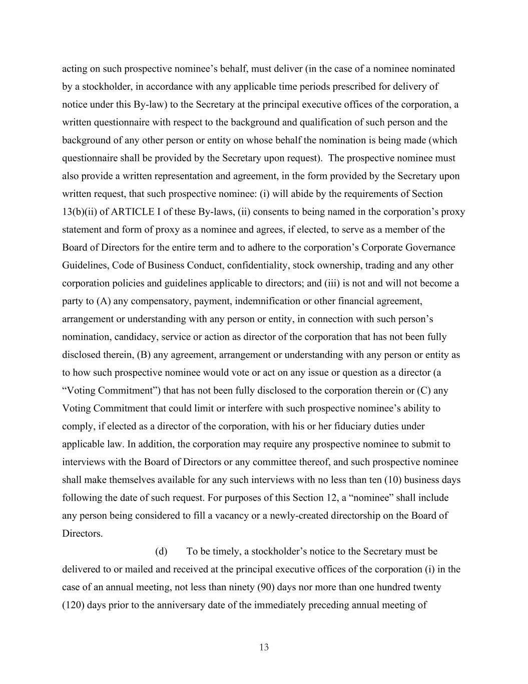 13 acting on such prospective nominee’s behalf, must deliver (in the case of a nominee nominated by a stockholder, in accordance with any applicable time periods prescribed for delivery of notice under this By-law) to the Secretary at the principal executive offices of the corporation, a written questionnaire with respect to the background and qualification of such person and the background of any other person or entity on whose behalf the nomination is being made (which questionnaire shall be provided by the Secretary upon request). The prospective nominee must also provide a written representation and agreement, in the form provided by the Secretary upon written request, that such prospective nominee: (i) will abide by the requirements of Section 13(b)(ii) of ARTICLE I of these By-laws, (ii) consents to being named in the corporation’s proxy statement and form of proxy as a nominee and agrees, if elected, to serve as a member of the Board of Directors for the entire term and to adhere to the corporation’s Corporate Governance Guidelines, Code of Business Conduct, confidentiality, stock ownership, trading and any other corporation policies and guidelines applicable to directors; and (iii) is not and will not become a party to (A) any compensatory, payment, indemnification or other financial agreement, arrangement or understanding with any person or entity, in connection with such person’s nomination, candidacy, service or action as director of the corporation that has not been fully disclosed therein, (B) any agreement, arrangement or understanding with any person or entity as to how such prospective nominee would vote or act on any issue or question as a director (a “Voting Commitment”) that has not been fully disclosed to the corporation therein or (C) any Voting Commitment that could limit or interfere with such prospective nominee’s ability to comply, if elected as a director of the corporation, with his or her fiduciary duties under applicable law. In addition, the corporation may require any prospective nominee to submit to interviews with the Board of Directors or any committee thereof, and such prospective nominee shall make themselves available for any such interviews with no less than ten (10) business days following the date of such request. For purposes of this Section 12, a “nominee” shall include any person being considered to fill a vacancy or a newly-created directorship on the Board of Directors. (d) To be timely, a stockholder’s notice to the Secretary must be delivered to or mailed and received at the principal executive offices of the corporation (i) in the case of an annual meeting, not less than ninety (90) days nor more than one hundred twenty (120) days prior to the anniversary date of the immediately preceding annual meeting of