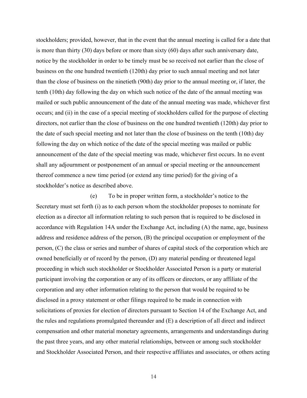 14 stockholders; provided, however, that in the event that the annual meeting is called for a date that is more than thirty (30) days before or more than sixty (60) days after such anniversary date, notice by the stockholder in order to be timely must be so received not earlier than the close of business on the one hundred twentieth (120th) day prior to such annual meeting and not later than the close of business on the ninetieth (90th) day prior to the annual meeting or, if later, the tenth (10th) day following the day on which such notice of the date of the annual meeting was mailed or such public announcement of the date of the annual meeting was made, whichever first occurs; and (ii) in the case of a special meeting of stockholders called for the purpose of electing directors, not earlier than the close of business on the one hundred twentieth (120th) day prior to the date of such special meeting and not later than the close of business on the tenth (10th) day following the day on which notice of the date of the special meeting was mailed or public announcement of the date of the special meeting was made, whichever first occurs. In no event shall any adjournment or postponement of an annual or special meeting or the announcement thereof commence a new time period (or extend any time period) for the giving of a stockholder’s notice as described above. (e) To be in proper written form, a stockholder’s notice to the Secretary must set forth (i) as to each person whom the stockholder proposes to nominate for election as a director all information relating to such person that is required to be disclosed in accordance with Regulation 14A under the Exchange Act, including (A) the name, age, business address and residence address of the person, (B) the principal occupation or employment of the person, (C) the class or series and number of shares of capital stock of the corporation which are owned beneficially or of record by the person, (D) any material pending or threatened legal proceeding in which such stockholder or Stockholder Associated Person is a party or material participant involving the corporation or any of its officers or directors, or any affiliate of the corporation and any other information relating to the person that would be required to be disclosed in a proxy statement or other filings required to be made in connection with solicitations of proxies for election of directors pursuant to Section 14 of the Exchange Act, and the rules and regulations promulgated thereunder and (E) a description of all direct and indirect compensation and other material monetary agreements, arrangements and understandings during the past three years, and any other material relationships, between or among such stockholder and Stockholder Associated Person, and their respective affiliates and associates, or others acting