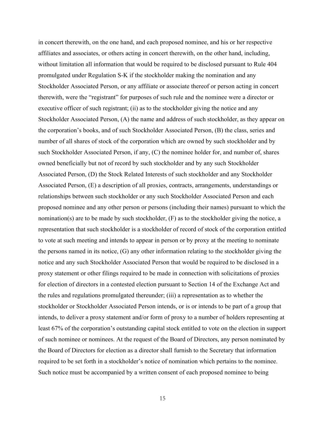 15 in concert therewith, on the one hand, and each proposed nominee, and his or her respective affiliates and associates, or others acting in concert therewith, on the other hand, including, without limitation all information that would be required to be disclosed pursuant to Rule 404 promulgated under Regulation S-K if the stockholder making the nomination and any Stockholder Associated Person, or any affiliate or associate thereof or person acting in concert therewith, were the “registrant” for purposes of such rule and the nominee were a director or executive officer of such registrant; (ii) as to the stockholder giving the notice and any Stockholder Associated Person, (A) the name and address of such stockholder, as they appear on the corporation’s books, and of such Stockholder Associated Person, (B) the class, series and number of all shares of stock of the corporation which are owned by such stockholder and by such Stockholder Associated Person, if any, (C) the nominee holder for, and number of, shares owned beneficially but not of record by such stockholder and by any such Stockholder Associated Person, (D) the Stock Related Interests of such stockholder and any Stockholder Associated Person, (E) a description of all proxies, contracts, arrangements, understandings or relationships between such stockholder or any such Stockholder Associated Person and each proposed nominee and any other person or persons (including their names) pursuant to which the nomination(s) are to be made by such stockholder, (F) as to the stockholder giving the notice, a representation that such stockholder is a stockholder of record of stock of the corporation entitled to vote at such meeting and intends to appear in person or by proxy at the meeting to nominate the persons named in its notice, (G) any other information relating to the stockholder giving the notice and any such Stockholder Associated Person that would be required to be disclosed in a proxy statement or other filings required to be made in connection with solicitations of proxies for election of directors in a contested election pursuant to Section 14 of the Exchange Act and the rules and regulations promulgated thereunder; (iii) a representation as to whether the stockholder or Stockholder Associated Person intends, or is or intends to be part of a group that intends, to deliver a proxy statement and/or form of proxy to a number of holders representing at least 67% of the corporation’s outstanding capital stock entitled to vote on the election in support of such nominee or nominees. At the request of the Board of Directors, any person nominated by the Board of Directors for election as a director shall furnish to the Secretary that information required to be set forth in a stockholder’s notice of nomination which pertains to the nominee. Such notice must be accompanied by a written consent of each proposed nominee to being