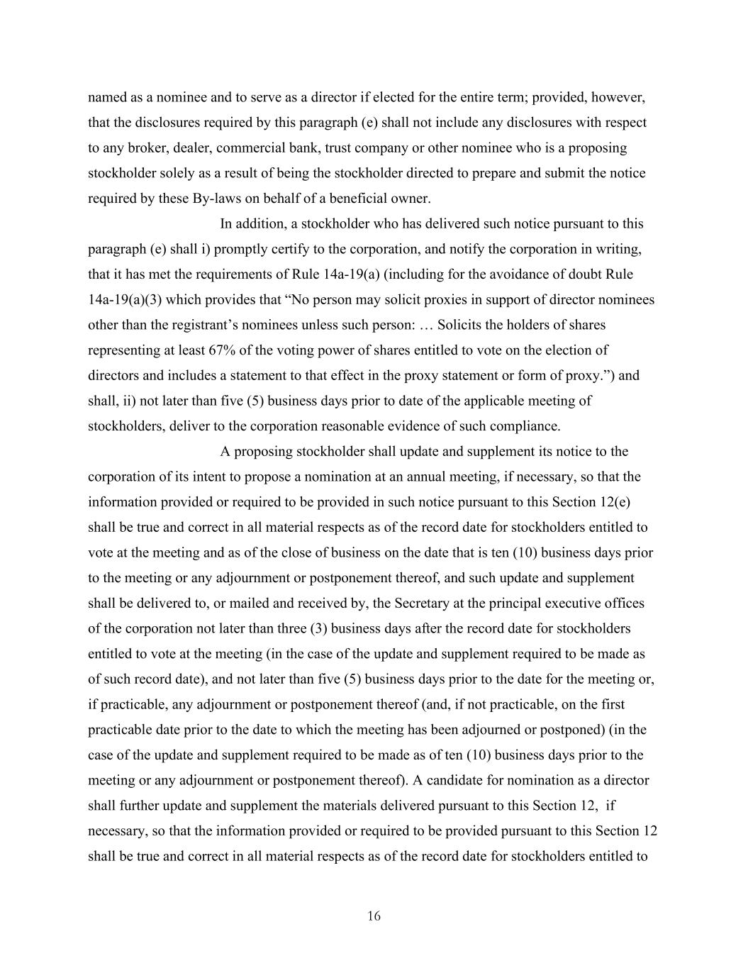 16 named as a nominee and to serve as a director if elected for the entire term; provided, however, that the disclosures required by this paragraph (e) shall not include any disclosures with respect to any broker, dealer, commercial bank, trust company or other nominee who is a proposing stockholder solely as a result of being the stockholder directed to prepare and submit the notice required by these By-laws on behalf of a beneficial owner. In addition, a stockholder who has delivered such notice pursuant to this paragraph (e) shall i) promptly certify to the corporation, and notify the corporation in writing, that it has met the requirements of Rule 14a-19(a) (including for the avoidance of doubt Rule 14a-19(a)(3) which provides that “No person may solicit proxies in support of director nominees other than the registrant’s nominees unless such person: … Solicits the holders of shares representing at least 67% of the voting power of shares entitled to vote on the election of directors and includes a statement to that effect in the proxy statement or form of proxy.”) and shall, ii) not later than five (5) business days prior to date of the applicable meeting of stockholders, deliver to the corporation reasonable evidence of such compliance. A proposing stockholder shall update and supplement its notice to the corporation of its intent to propose a nomination at an annual meeting, if necessary, so that the information provided or required to be provided in such notice pursuant to this Section 12(e) shall be true and correct in all material respects as of the record date for stockholders entitled to vote at the meeting and as of the close of business on the date that is ten (10) business days prior to the meeting or any adjournment or postponement thereof, and such update and supplement shall be delivered to, or mailed and received by, the Secretary at the principal executive offices of the corporation not later than three (3) business days after the record date for stockholders entitled to vote at the meeting (in the case of the update and supplement required to be made as of such record date), and not later than five (5) business days prior to the date for the meeting or, if practicable, any adjournment or postponement thereof (and, if not practicable, on the first practicable date prior to the date to which the meeting has been adjourned or postponed) (in the case of the update and supplement required to be made as of ten (10) business days prior to the meeting or any adjournment or postponement thereof). A candidate for nomination as a director shall further update and supplement the materials delivered pursuant to this Section 12, if necessary, so that the information provided or required to be provided pursuant to this Section 12 shall be true and correct in all material respects as of the record date for stockholders entitled to