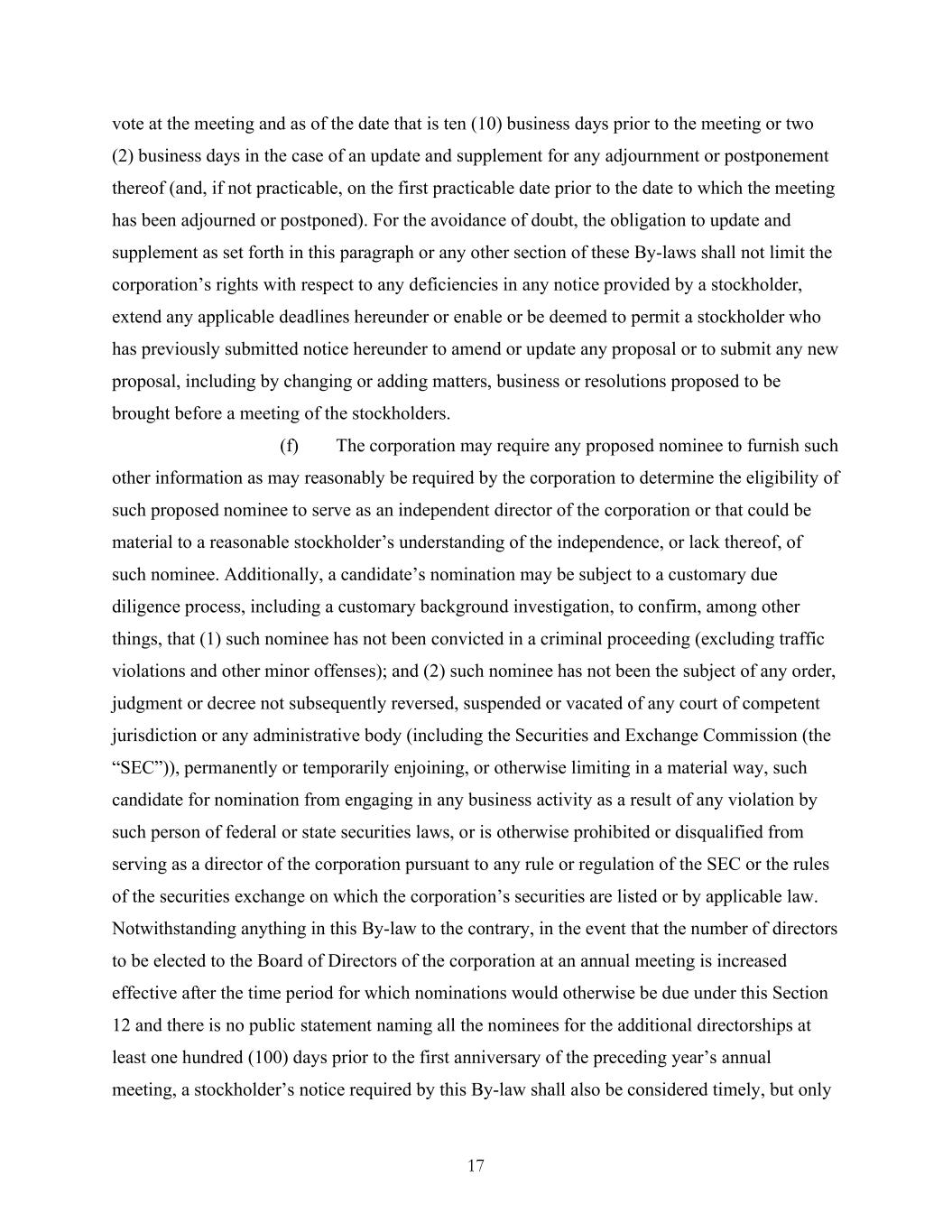 17 vote at the meeting and as of the date that is ten (10) business days prior to the meeting or two (2) business days in the case of an update and supplement for any adjournment or postponement thereof (and, if not practicable, on the first practicable date prior to the date to which the meeting has been adjourned or postponed). For the avoidance of doubt, the obligation to update and supplement as set forth in this paragraph or any other section of these By-laws shall not limit the corporation’s rights with respect to any deficiencies in any notice provided by a stockholder, extend any applicable deadlines hereunder or enable or be deemed to permit a stockholder who has previously submitted notice hereunder to amend or update any proposal or to submit any new proposal, including by changing or adding matters, business or resolutions proposed to be brought before a meeting of the stockholders. (f) The corporation may require any proposed nominee to furnish such other information as may reasonably be required by the corporation to determine the eligibility of such proposed nominee to serve as an independent director of the corporation or that could be material to a reasonable stockholder’s understanding of the independence, or lack thereof, of such nominee. Additionally, a candidate’s nomination may be subject to a customary due diligence process, including a customary background investigation, to confirm, among other things, that (1) such nominee has not been convicted in a criminal proceeding (excluding traffic violations and other minor offenses); and (2) such nominee has not been the subject of any order, judgment or decree not subsequently reversed, suspended or vacated of any court of competent jurisdiction or any administrative body (including the Securities and Exchange Commission (the “SEC”)), permanently or temporarily enjoining, or otherwise limiting in a material way, such candidate for nomination from engaging in any business activity as a result of any violation by such person of federal or state securities laws, or is otherwise prohibited or disqualified from serving as a director of the corporation pursuant to any rule or regulation of the SEC or the rules of the securities exchange on which the corporation’s securities are listed or by applicable law. Notwithstanding anything in this By-law to the contrary, in the event that the number of directors to be elected to the Board of Directors of the corporation at an annual meeting is increased effective after the time period for which nominations would otherwise be due under this Section 12 and there is no public statement naming all the nominees for the additional directorships at least one hundred (100) days prior to the first anniversary of the preceding year’s annual meeting, a stockholder’s notice required by this By-law shall also be considered timely, but only