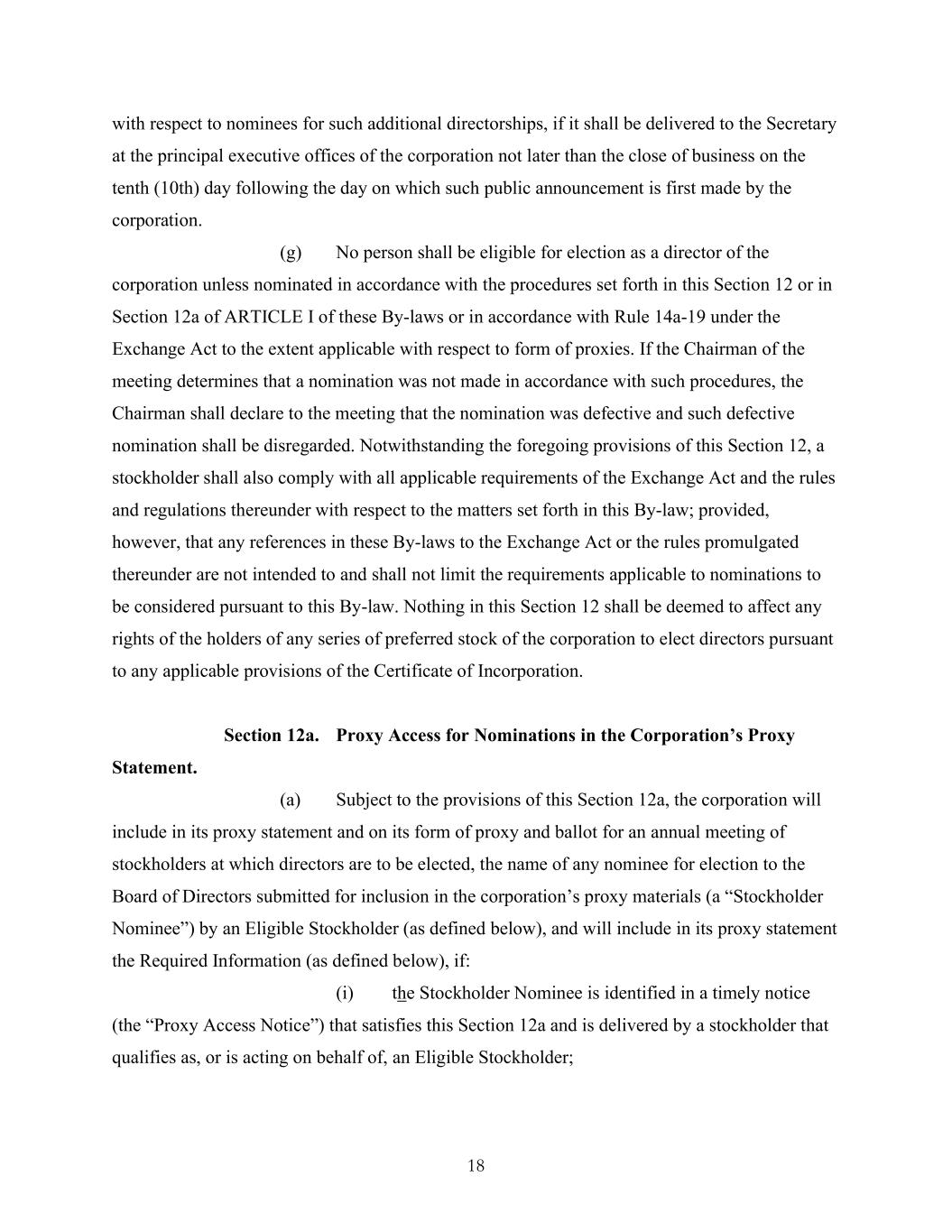 18 with respect to nominees for such additional directorships, if it shall be delivered to the Secretary at the principal executive offices of the corporation not later than the close of business on the tenth (10th) day following the day on which such public announcement is first made by the corporation. (g) No person shall be eligible for election as a director of the corporation unless nominated in accordance with the procedures set forth in this Section 12 or in Section 12a of ARTICLE I of these By-laws or in accordance with Rule 14a-19 under the Exchange Act to the extent applicable with respect to form of proxies. If the Chairman of the meeting determines that a nomination was not made in accordance with such procedures, the Chairman shall declare to the meeting that the nomination was defective and such defective nomination shall be disregarded. Notwithstanding the foregoing provisions of this Section 12, a stockholder shall also comply with all applicable requirements of the Exchange Act and the rules and regulations thereunder with respect to the matters set forth in this By-law; provided, however, that any references in these By-laws to the Exchange Act or the rules promulgated thereunder are not intended to and shall not limit the requirements applicable to nominations to be considered pursuant to this By-law. Nothing in this Section 12 shall be deemed to affect any rights of the holders of any series of preferred stock of the corporation to elect directors pursuant to any applicable provisions of the Certificate of Incorporation. Section 12a. Proxy Access for Nominations in the Corporation’s Proxy Statement. (a) Subject to the provisions of this Section 12a, the corporation will include in its proxy statement and on its form of proxy and ballot for an annual meeting of stockholders at which directors are to be elected, the name of any nominee for election to the Board of Directors submitted for inclusion in the corporation’s proxy materials (a “Stockholder Nominee”) by an Eligible Stockholder (as defined below), and will include in its proxy statement the Required Information (as defined below), if: (i) the Stockholder Nominee is identified in a timely notice (the “Proxy Access Notice”) that satisfies this Section 12a and is delivered by a stockholder that qualifies as, or is acting on behalf of, an Eligible Stockholder;