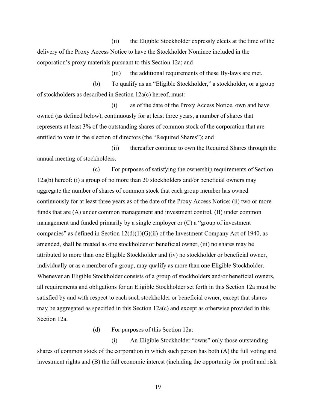 19 (ii) the Eligible Stockholder expressly elects at the time of the delivery of the Proxy Access Notice to have the Stockholder Nominee included in the corporation’s proxy materials pursuant to this Section 12a; and (iii) the additional requirements of these By-laws are met. (b) To qualify as an “Eligible Stockholder,” a stockholder, or a group of stockholders as described in Section 12a(c) hereof, must: (i) as of the date of the Proxy Access Notice, own and have owned (as defined below), continuously for at least three years, a number of shares that represents at least 3% of the outstanding shares of common stock of the corporation that are entitled to vote in the election of directors (the “Required Shares”); and (ii) thereafter continue to own the Required Shares through the annual meeting of stockholders. (c) For purposes of satisfying the ownership requirements of Section 12a(b) hereof: (i) a group of no more than 20 stockholders and/or beneficial owners may aggregate the number of shares of common stock that each group member has owned continuously for at least three years as of the date of the Proxy Access Notice; (ii) two or more funds that are (A) under common management and investment control, (B) under common management and funded primarily by a single employer or (C) a “group of investment companies” as defined in Section 12(d)(1)(G)(ii) of the Investment Company Act of 1940, as amended, shall be treated as one stockholder or beneficial owner, (iii) no shares may be attributed to more than one Eligible Stockholder and (iv) no stockholder or beneficial owner, individually or as a member of a group, may qualify as more than one Eligible Stockholder. Whenever an Eligible Stockholder consists of a group of stockholders and/or beneficial owners, all requirements and obligations for an Eligible Stockholder set forth in this Section 12a must be satisfied by and with respect to each such stockholder or beneficial owner, except that shares may be aggregated as specified in this Section 12a(c) and except as otherwise provided in this Section 12a. (d) For purposes of this Section 12a: (i) An Eligible Stockholder “owns” only those outstanding shares of common stock of the corporation in which such person has both (A) the full voting and investment rights and (B) the full economic interest (including the opportunity for profit and risk