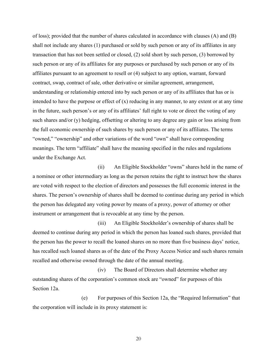 20 of loss); provided that the number of shares calculated in accordance with clauses (A) and (B) shall not include any shares (1) purchased or sold by such person or any of its affiliates in any transaction that has not been settled or closed, (2) sold short by such person, (3) borrowed by such person or any of its affiliates for any purposes or purchased by such person or any of its affiliates pursuant to an agreement to resell or (4) subject to any option, warrant, forward contract, swap, contract of sale, other derivative or similar agreement, arrangement, understanding or relationship entered into by such person or any of its affiliates that has or is intended to have the purpose or effect of (x) reducing in any manner, to any extent or at any time in the future, such person’s or any of its affiliates’ full right to vote or direct the voting of any such shares and/or (y) hedging, offsetting or altering to any degree any gain or loss arising from the full economic ownership of such shares by such person or any of its affiliates. The terms “owned,” “ownership” and other variations of the word “own” shall have corresponding meanings. The term “affiliate” shall have the meaning specified in the rules and regulations under the Exchange Act. (ii) An Eligible Stockholder “owns” shares held in the name of a nominee or other intermediary as long as the person retains the right to instruct how the shares are voted with respect to the election of directors and possesses the full economic interest in the shares. The person’s ownership of shares shall be deemed to continue during any period in which the person has delegated any voting power by means of a proxy, power of attorney or other instrument or arrangement that is revocable at any time by the person. (iii) An Eligible Stockholder’s ownership of shares shall be deemed to continue during any period in which the person has loaned such shares, provided that the person has the power to recall the loaned shares on no more than five business days’ notice, has recalled such loaned shares as of the date of the Proxy Access Notice and such shares remain recalled and otherwise owned through the date of the annual meeting. (iv) The Board of Directors shall determine whether any outstanding shares of the corporation’s common stock are “owned” for purposes of this Section 12a. (e) For purposes of this Section 12a, the “Required Information” that the corporation will include in its proxy statement is: