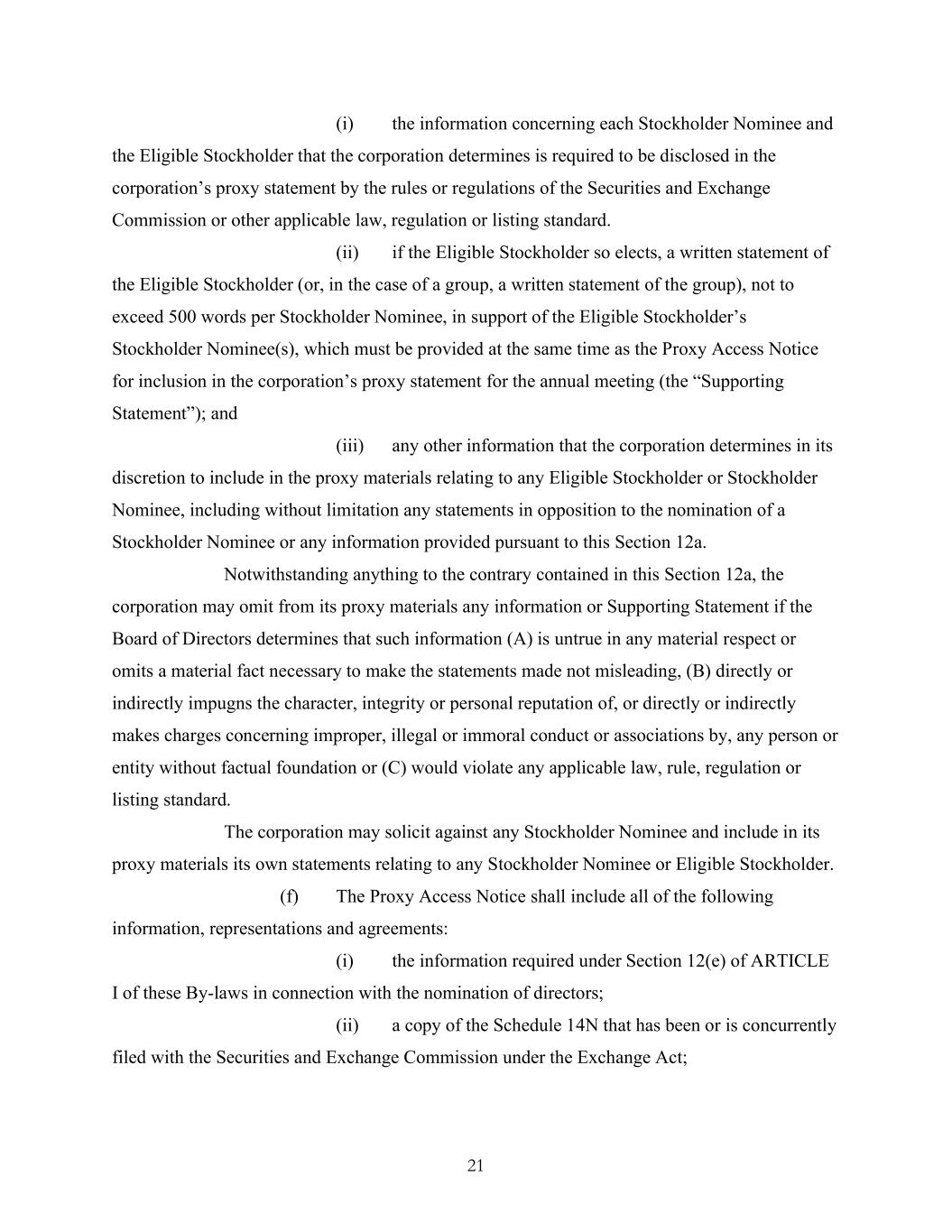 21 (i) the information concerning each Stockholder Nominee and the Eligible Stockholder that the corporation determines is required to be disclosed in the corporation’s proxy statement by the rules or regulations of the Securities and Exchange Commission or other applicable law, regulation or listing standard. (ii) if the Eligible Stockholder so elects, a written statement of the Eligible Stockholder (or, in the case of a group, a written statement of the group), not to exceed 500 words per Stockholder Nominee, in support of the Eligible Stockholder’s Stockholder Nominee(s), which must be provided at the same time as the Proxy Access Notice for inclusion in the corporation’s proxy statement for the annual meeting (the “Supporting Statement”); and (iii) any other information that the corporation determines in its discretion to include in the proxy materials relating to any Eligible Stockholder or Stockholder Nominee, including without limitation any statements in opposition to the nomination of a Stockholder Nominee or any information provided pursuant to this Section 12a. Notwithstanding anything to the contrary contained in this Section 12a, the corporation may omit from its proxy materials any information or Supporting Statement if the Board of Directors determines that such information (A) is untrue in any material respect or omits a material fact necessary to make the statements made not misleading, (B) directly or indirectly impugns the character, integrity or personal reputation of, or directly or indirectly makes charges concerning improper, illegal or immoral conduct or associations by, any person or entity without factual foundation or (C) would violate any applicable law, rule, regulation or listing standard. The corporation may solicit against any Stockholder Nominee and include in its proxy materials its own statements relating to any Stockholder Nominee or Eligible Stockholder. (f) The Proxy Access Notice shall include all of the following information, representations and agreements: (i) the information required under Section 12(e) of ARTICLE I of these By-laws in connection with the nomination of directors; (ii) a copy of the Schedule 14N that has been or is concurrently filed with the Securities and Exchange Commission under the Exchange Act;