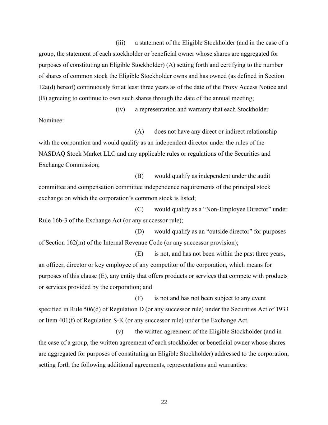 22 (iii) a statement of the Eligible Stockholder (and in the case of a group, the statement of each stockholder or beneficial owner whose shares are aggregated for purposes of constituting an Eligible Stockholder) (A) setting forth and certifying to the number of shares of common stock the Eligible Stockholder owns and has owned (as defined in Section 12a(d) hereof) continuously for at least three years as of the date of the Proxy Access Notice and (B) agreeing to continue to own such shares through the date of the annual meeting; (iv) a representation and warranty that each Stockholder Nominee: (A) does not have any direct or indirect relationship with the corporation and would qualify as an independent director under the rules of the NASDAQ Stock Market LLC and any applicable rules or regulations of the Securities and Exchange Commission; (B) would qualify as independent under the audit committee and compensation committee independence requirements of the principal stock exchange on which the corporation’s common stock is listed; (C) would qualify as a “Non-Employee Director” under Rule 16b-3 of the Exchange Act (or any successor rule); (D) would qualify as an “outside director” for purposes of Section 162(m) of the Internal Revenue Code (or any successor provision); (E) is not, and has not been within the past three years, an officer, director or key employee of any competitor of the corporation, which means for purposes of this clause (E), any entity that offers products or services that compete with products or services provided by the corporation; and (F) is not and has not been subject to any event specified in Rule 506(d) of Regulation D (or any successor rule) under the Securities Act of 1933 or Item 401(f) of Regulation S-K (or any successor rule) under the Exchange Act. (v) the written agreement of the Eligible Stockholder (and in the case of a group, the written agreement of each stockholder or beneficial owner whose shares are aggregated for purposes of constituting an Eligible Stockholder) addressed to the corporation, setting forth the following additional agreements, representations and warranties: