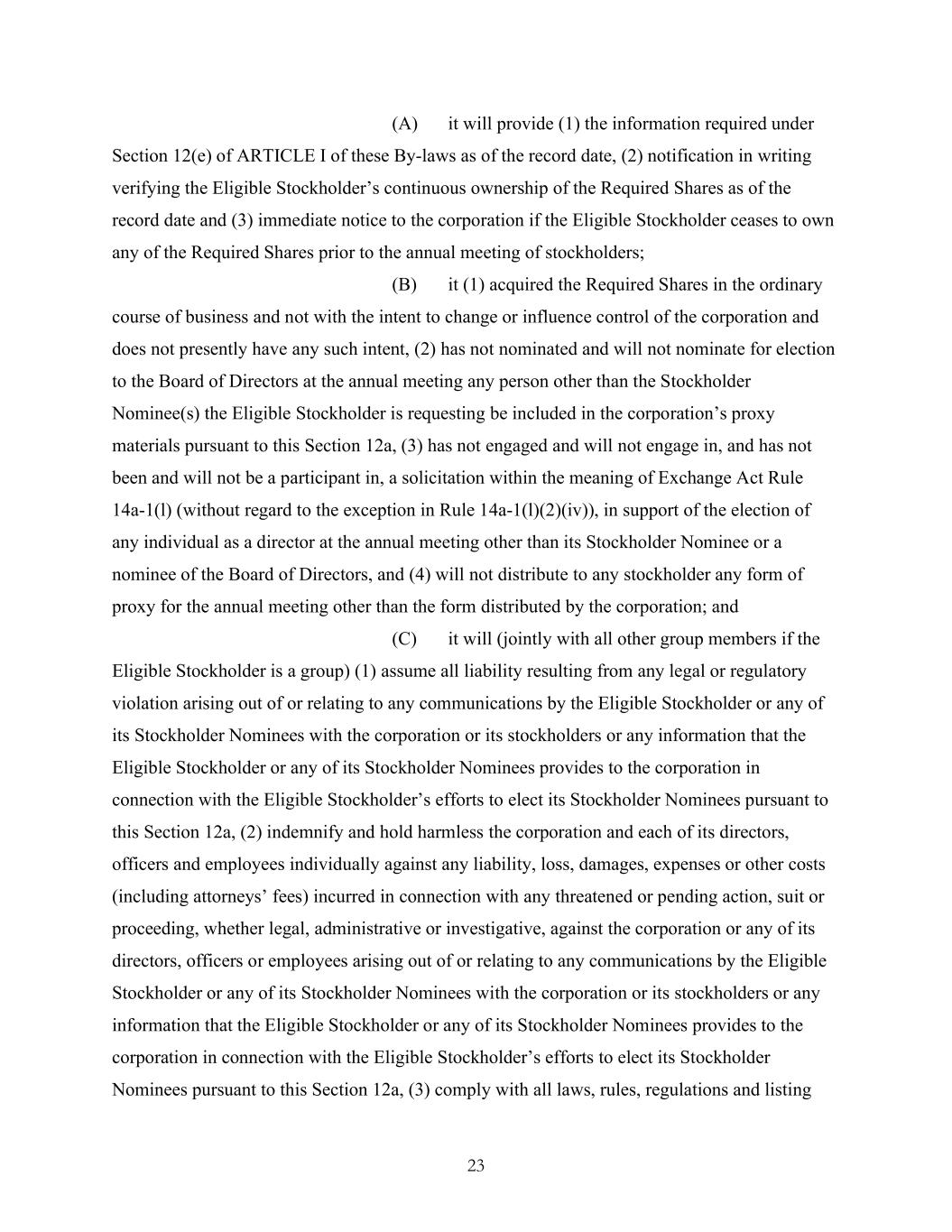 23 (A) it will provide (1) the information required under Section 12(e) of ARTICLE I of these By-laws as of the record date, (2) notification in writing verifying the Eligible Stockholder’s continuous ownership of the Required Shares as of the record date and (3) immediate notice to the corporation if the Eligible Stockholder ceases to own any of the Required Shares prior to the annual meeting of stockholders; (B) it (1) acquired the Required Shares in the ordinary course of business and not with the intent to change or influence control of the corporation and does not presently have any such intent, (2) has not nominated and will not nominate for election to the Board of Directors at the annual meeting any person other than the Stockholder Nominee(s) the Eligible Stockholder is requesting be included in the corporation’s proxy materials pursuant to this Section 12a, (3) has not engaged and will not engage in, and has not been and will not be a participant in, a solicitation within the meaning of Exchange Act Rule 14a-1(l) (without regard to the exception in Rule 14a-1(l)(2)(iv)), in support of the election of any individual as a director at the annual meeting other than its Stockholder Nominee or a nominee of the Board of Directors, and (4) will not distribute to any stockholder any form of proxy for the annual meeting other than the form distributed by the corporation; and (C) it will (jointly with all other group members if the Eligible Stockholder is a group) (1) assume all liability resulting from any legal or regulatory violation arising out of or relating to any communications by the Eligible Stockholder or any of its Stockholder Nominees with the corporation or its stockholders or any information that the Eligible Stockholder or any of its Stockholder Nominees provides to the corporation in connection with the Eligible Stockholder’s efforts to elect its Stockholder Nominees pursuant to this Section 12a, (2) indemnify and hold harmless the corporation and each of its directors, officers and employees individually against any liability, loss, damages, expenses or other costs (including attorneys’ fees) incurred in connection with any threatened or pending action, suit or proceeding, whether legal, administrative or investigative, against the corporation or any of its directors, officers or employees arising out of or relating to any communications by the Eligible Stockholder or any of its Stockholder Nominees with the corporation or its stockholders or any information that the Eligible Stockholder or any of its Stockholder Nominees provides to the corporation in connection with the Eligible Stockholder’s efforts to elect its Stockholder Nominees pursuant to this Section 12a, (3) comply with all laws, rules, regulations and listing