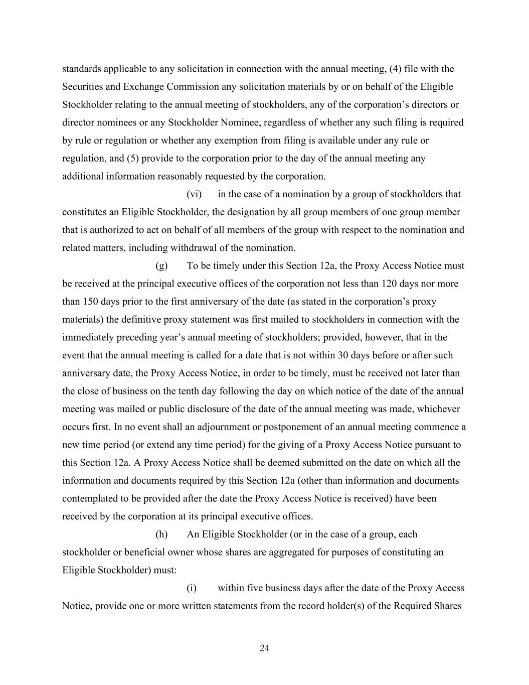 24 standards applicable to any solicitation in connection with the annual meeting, (4) file with the Securities and Exchange Commission any solicitation materials by or on behalf of the Eligible Stockholder relating to the annual meeting of stockholders, any of the corporation’s directors or director nominees or any Stockholder Nominee, regardless of whether any such filing is required by rule or regulation or whether any exemption from filing is available under any rule or regulation, and (5) provide to the corporation prior to the day of the annual meeting any additional information reasonably requested by the corporation. (vi) in the case of a nomination by a group of stockholders that constitutes an Eligible Stockholder, the designation by all group members of one group member that is authorized to act on behalf of all members of the group with respect to the nomination and related matters, including withdrawal of the nomination. (g) To be timely under this Section 12a, the Proxy Access Notice must be received at the principal executive offices of the corporation not less than 120 days nor more than 150 days prior to the first anniversary of the date (as stated in the corporation’s proxy materials) the definitive proxy statement was first mailed to stockholders in connection with the immediately preceding year’s annual meeting of stockholders; provided, however, that in the event that the annual meeting is called for a date that is not within 30 days before or after such anniversary date, the Proxy Access Notice, in order to be timely, must be received not later than the close of business on the tenth day following the day on which notice of the date of the annual meeting was mailed or public disclosure of the date of the annual meeting was made, whichever occurs first. In no event shall an adjournment or postponement of an annual meeting commence a new time period (or extend any time period) for the giving of a Proxy Access Notice pursuant to this Section 12a. A Proxy Access Notice shall be deemed submitted on the date on which all the information and documents required by this Section 12a (other than information and documents contemplated to be provided after the date the Proxy Access Notice is received) have been received by the corporation at its principal executive offices. (h) An Eligible Stockholder (or in the case of a group, each stockholder or beneficial owner whose shares are aggregated for purposes of constituting an Eligible Stockholder) must: (i) within five business days after the date of the Proxy Access Notice, provide one or more written statements from the record holder(s) of the Required Shares