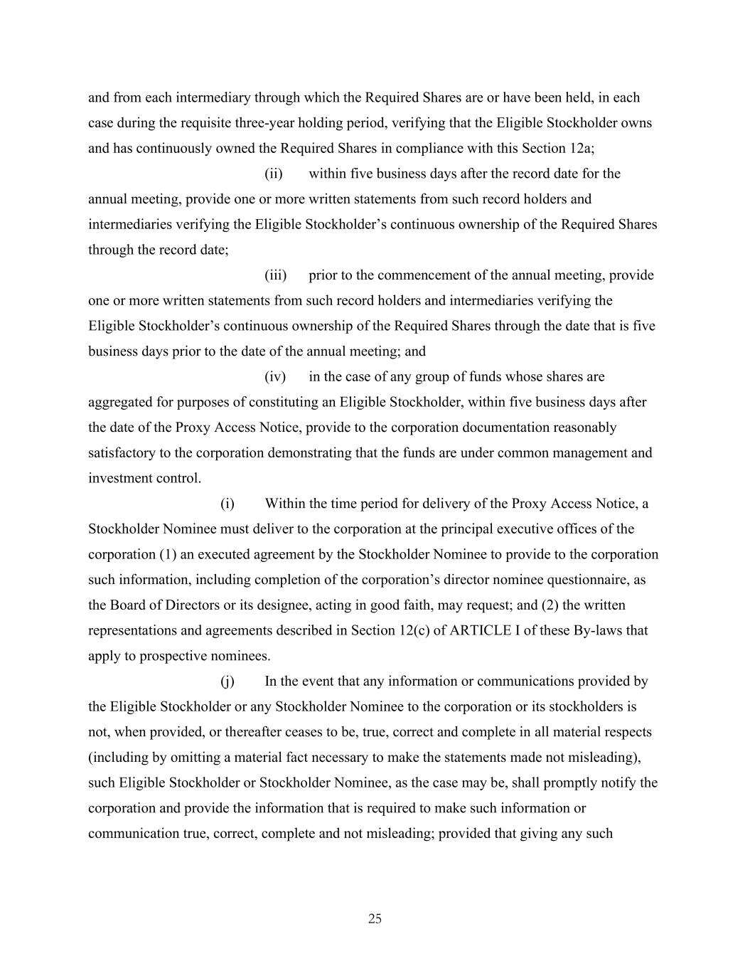 25 and from each intermediary through which the Required Shares are or have been held, in each case during the requisite three-year holding period, verifying that the Eligible Stockholder owns and has continuously owned the Required Shares in compliance with this Section 12a; (ii) within five business days after the record date for the annual meeting, provide one or more written statements from such record holders and intermediaries verifying the Eligible Stockholder’s continuous ownership of the Required Shares through the record date; (iii) prior to the commencement of the annual meeting, provide one or more written statements from such record holders and intermediaries verifying the Eligible Stockholder’s continuous ownership of the Required Shares through the date that is five business days prior to the date of the annual meeting; and (iv) in the case of any group of funds whose shares are aggregated for purposes of constituting an Eligible Stockholder, within five business days after the date of the Proxy Access Notice, provide to the corporation documentation reasonably satisfactory to the corporation demonstrating that the funds are under common management and investment control. (i) Within the time period for delivery of the Proxy Access Notice, a Stockholder Nominee must deliver to the corporation at the principal executive offices of the corporation (1) an executed agreement by the Stockholder Nominee to provide to the corporation such information, including completion of the corporation’s director nominee questionnaire, as the Board of Directors or its designee, acting in good faith, may request; and (2) the written representations and agreements described in Section 12(c) of ARTICLE I of these By-laws that apply to prospective nominees. (j) In the event that any information or communications provided by the Eligible Stockholder or any Stockholder Nominee to the corporation or its stockholders is not, when provided, or thereafter ceases to be, true, correct and complete in all material respects (including by omitting a material fact necessary to make the statements made not misleading), such Eligible Stockholder or Stockholder Nominee, as the case may be, shall promptly notify the corporation and provide the information that is required to make such information or communication true, correct, complete and not misleading; provided that giving any such