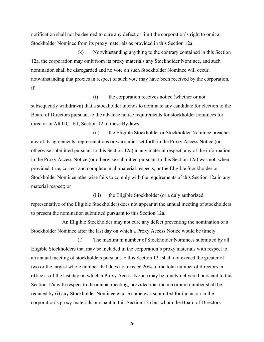 26 notification shall not be deemed to cure any defect or limit the corporation’s right to omit a Stockholder Nominee from its proxy materials as provided in this Section 12a. (k) Notwithstanding anything to the contrary contained in this Section 12a, the corporation may omit from its proxy materials any Stockholder Nominee, and such nomination shall be disregarded and no vote on such Stockholder Nominee will occur, notwithstanding that proxies in respect of such vote may have been received by the corporation, if: (i) the corporation receives notice (whether or not subsequently withdrawn) that a stockholder intends to nominate any candidate for election to the Board of Directors pursuant to the advance notice requirements for stockholder nominees for director in ARTICLE I, Section 12 of these By-laws; (ii) the Eligible Stockholder or Stockholder Nominee breaches any of its agreements, representations or warranties set forth in the Proxy Access Notice (or otherwise submitted pursuant to this Section 12a) in any material respect, any of the information in the Proxy Access Notice (or otherwise submitted pursuant to this Section 12a) was not, when provided, true, correct and complete in all material respects, or the Eligible Stockholder or Stockholder Nominee otherwise fails to comply with the requirements of this Section 12a in any material respect; or (iii) the Eligible Stockholder (or a duly authorized representative of the Eligible Stockholder) does not appear at the annual meeting of stockholders to present the nomination submitted pursuant to this Section 12a. An Eligible Stockholder may not cure any defect preventing the nomination of a Stockholder Nominee after the last day on which a Proxy Access Notice would be timely. (l) The maximum number of Stockholder Nominees submitted by all Eligible Stockholders that may be included in the corporation’s proxy materials with respect to an annual meeting of stockholders pursuant to this Section 12a shall not exceed the greater of two or the largest whole number that does not exceed 20% of the total number of directors in office as of the last day on which a Proxy Access Notice may be timely delivered pursuant to this Section 12a with respect to the annual meeting; provided that the maximum number shall be reduced by (i) any Stockholder Nominee whose name was submitted for inclusion in the corporation’s proxy materials pursuant to this Section 12a but whom the Board of Directors
