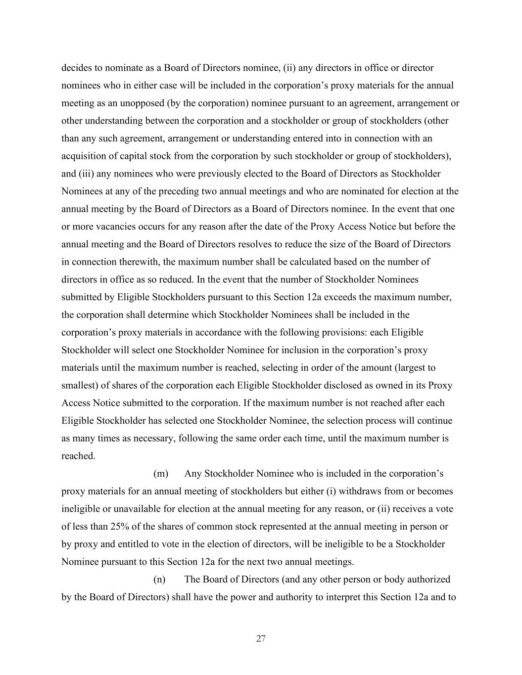 27 decides to nominate as a Board of Directors nominee, (ii) any directors in office or director nominees who in either case will be included in the corporation’s proxy materials for the annual meeting as an unopposed (by the corporation) nominee pursuant to an agreement, arrangement or other understanding between the corporation and a stockholder or group of stockholders (other than any such agreement, arrangement or understanding entered into in connection with an acquisition of capital stock from the corporation by such stockholder or group of stockholders), and (iii) any nominees who were previously elected to the Board of Directors as Stockholder Nominees at any of the preceding two annual meetings and who are nominated for election at the annual meeting by the Board of Directors as a Board of Directors nominee. In the event that one or more vacancies occurs for any reason after the date of the Proxy Access Notice but before the annual meeting and the Board of Directors resolves to reduce the size of the Board of Directors in connection therewith, the maximum number shall be calculated based on the number of directors in office as so reduced. In the event that the number of Stockholder Nominees submitted by Eligible Stockholders pursuant to this Section 12a exceeds the maximum number, the corporation shall determine which Stockholder Nominees shall be included in the corporation’s proxy materials in accordance with the following provisions: each Eligible Stockholder will select one Stockholder Nominee for inclusion in the corporation’s proxy materials until the maximum number is reached, selecting in order of the amount (largest to smallest) of shares of the corporation each Eligible Stockholder disclosed as owned in its Proxy Access Notice submitted to the corporation. If the maximum number is not reached after each Eligible Stockholder has selected one Stockholder Nominee, the selection process will continue as many times as necessary, following the same order each time, until the maximum number is reached. (m) Any Stockholder Nominee who is included in the corporation’s proxy materials for an annual meeting of stockholders but either (i) withdraws from or becomes ineligible or unavailable for election at the annual meeting for any reason, or (ii) receives a vote of less than 25% of the shares of common stock represented at the annual meeting in person or by proxy and entitled to vote in the election of directors, will be ineligible to be a Stockholder Nominee pursuant to this Section 12a for the next two annual meetings. (n) The Board of Directors (and any other person or body authorized by the Board of Directors) shall have the power and authority to interpret this Section 12a and to