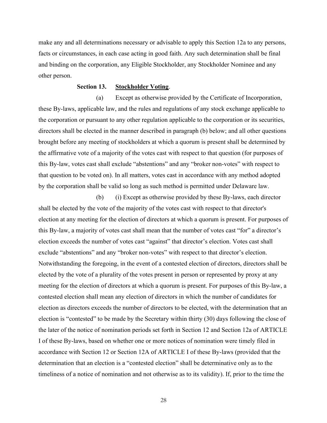 28 make any and all determinations necessary or advisable to apply this Section 12a to any persons, facts or circumstances, in each case acting in good faith. Any such determination shall be final and binding on the corporation, any Eligible Stockholder, any Stockholder Nominee and any other person. Section 13. Stockholder Voting. (a) Except as otherwise provided by the Certificate of Incorporation, these By-laws, applicable law, and the rules and regulations of any stock exchange applicable to the corporation or pursuant to any other regulation applicable to the corporation or its securities, directors shall be elected in the manner described in paragraph (b) below; and all other questions brought before any meeting of stockholders at which a quorum is present shall be determined by the affirmative vote of a majority of the votes cast with respect to that question (for purposes of this By-law, votes cast shall exclude “abstentions” and any “broker non-votes” with respect to that question to be voted on). In all matters, votes cast in accordance with any method adopted by the corporation shall be valid so long as such method is permitted under Delaware law. (b) (i) Except as otherwise provided by these By-laws, each director shall be elected by the vote of the majority of the votes cast with respect to that director's election at any meeting for the election of directors at which a quorum is present. For purposes of this By-law, a majority of votes cast shall mean that the number of votes cast “for” a director’s election exceeds the number of votes cast “against” that director’s election. Votes cast shall exclude “abstentions” and any “broker non-votes” with respect to that director’s election. Notwithstanding the foregoing, in the event of a contested election of directors, directors shall be elected by the vote of a plurality of the votes present in person or represented by proxy at any meeting for the election of directors at which a quorum is present. For purposes of this By-law, a contested election shall mean any election of directors in which the number of candidates for election as directors exceeds the number of directors to be elected, with the determination that an election is “contested” to be made by the Secretary within thirty (30) days following the close of the later of the notice of nomination periods set forth in Section 12 and Section 12a of ARTICLE I of these By-laws, based on whether one or more notices of nomination were timely filed in accordance with Section 12 or Section 12A of ARTICLE I of these By-laws (provided that the determination that an election is a “contested election” shall be determinative only as to the timeliness of a notice of nomination and not otherwise as to its validity). If, prior to the time the