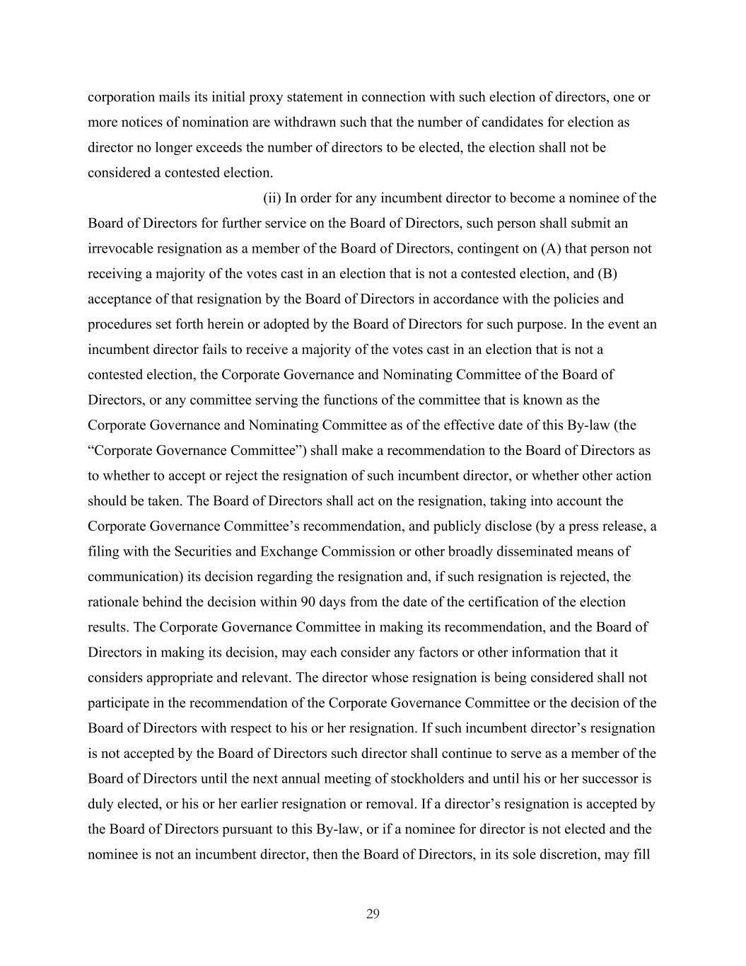 29 corporation mails its initial proxy statement in connection with such election of directors, one or more notices of nomination are withdrawn such that the number of candidates for election as director no longer exceeds the number of directors to be elected, the election shall not be considered a contested election. (ii) In order for any incumbent director to become a nominee of the Board of Directors for further service on the Board of Directors, such person shall submit an irrevocable resignation as a member of the Board of Directors, contingent on (A) that person not receiving a majority of the votes cast in an election that is not a contested election, and (B) acceptance of that resignation by the Board of Directors in accordance with the policies and procedures set forth herein or adopted by the Board of Directors for such purpose. In the event an incumbent director fails to receive a majority of the votes cast in an election that is not a contested election, the Corporate Governance and Nominating Committee of the Board of Directors, or any committee serving the functions of the committee that is known as the Corporate Governance and Nominating Committee as of the effective date of this By-law (the “Corporate Governance Committee”) shall make a recommendation to the Board of Directors as to whether to accept or reject the resignation of such incumbent director, or whether other action should be taken. The Board of Directors shall act on the resignation, taking into account the Corporate Governance Committee’s recommendation, and publicly disclose (by a press release, a filing with the Securities and Exchange Commission or other broadly disseminated means of communication) its decision regarding the resignation and, if such resignation is rejected, the rationale behind the decision within 90 days from the date of the certification of the election results. The Corporate Governance Committee in making its recommendation, and the Board of Directors in making its decision, may each consider any factors or other information that it considers appropriate and relevant. The director whose resignation is being considered shall not participate in the recommendation of the Corporate Governance Committee or the decision of the Board of Directors with respect to his or her resignation. If such incumbent director’s resignation is not accepted by the Board of Directors such director shall continue to serve as a member of the Board of Directors until the next annual meeting of stockholders and until his or her successor is duly elected, or his or her earlier resignation or removal. If a director’s resignation is accepted by the Board of Directors pursuant to this By-law, or if a nominee for director is not elected and the nominee is not an incumbent director, then the Board of Directors, in its sole discretion, may fill