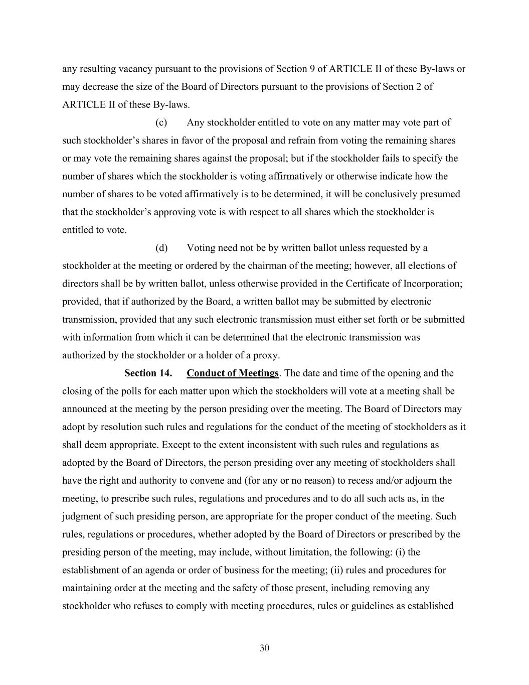 30 any resulting vacancy pursuant to the provisions of Section 9 of ARTICLE II of these By-laws or may decrease the size of the Board of Directors pursuant to the provisions of Section 2 of ARTICLE II of these By-laws. (c) Any stockholder entitled to vote on any matter may vote part of such stockholder’s shares in favor of the proposal and refrain from voting the remaining shares or may vote the remaining shares against the proposal; but if the stockholder fails to specify the number of shares which the stockholder is voting affirmatively or otherwise indicate how the number of shares to be voted affirmatively is to be determined, it will be conclusively presumed that the stockholder’s approving vote is with respect to all shares which the stockholder is entitled to vote. (d) Voting need not be by written ballot unless requested by a stockholder at the meeting or ordered by the chairman of the meeting; however, all elections of directors shall be by written ballot, unless otherwise provided in the Certificate of Incorporation; provided, that if authorized by the Board, a written ballot may be submitted by electronic transmission, provided that any such electronic transmission must either set forth or be submitted with information from which it can be determined that the electronic transmission was authorized by the stockholder or a holder of a proxy. Section 14. Conduct of Meetings. The date and time of the opening and the closing of the polls for each matter upon which the stockholders will vote at a meeting shall be announced at the meeting by the person presiding over the meeting. The Board of Directors may adopt by resolution such rules and regulations for the conduct of the meeting of stockholders as it shall deem appropriate. Except to the extent inconsistent with such rules and regulations as adopted by the Board of Directors, the person presiding over any meeting of stockholders shall have the right and authority to convene and (for any or no reason) to recess and/or adjourn the meeting, to prescribe such rules, regulations and procedures and to do all such acts as, in the judgment of such presiding person, are appropriate for the proper conduct of the meeting. Such rules, regulations or procedures, whether adopted by the Board of Directors or prescribed by the presiding person of the meeting, may include, without limitation, the following: (i) the establishment of an agenda or order of business for the meeting; (ii) rules and procedures for maintaining order at the meeting and the safety of those present, including removing any stockholder who refuses to comply with meeting procedures, rules or guidelines as established